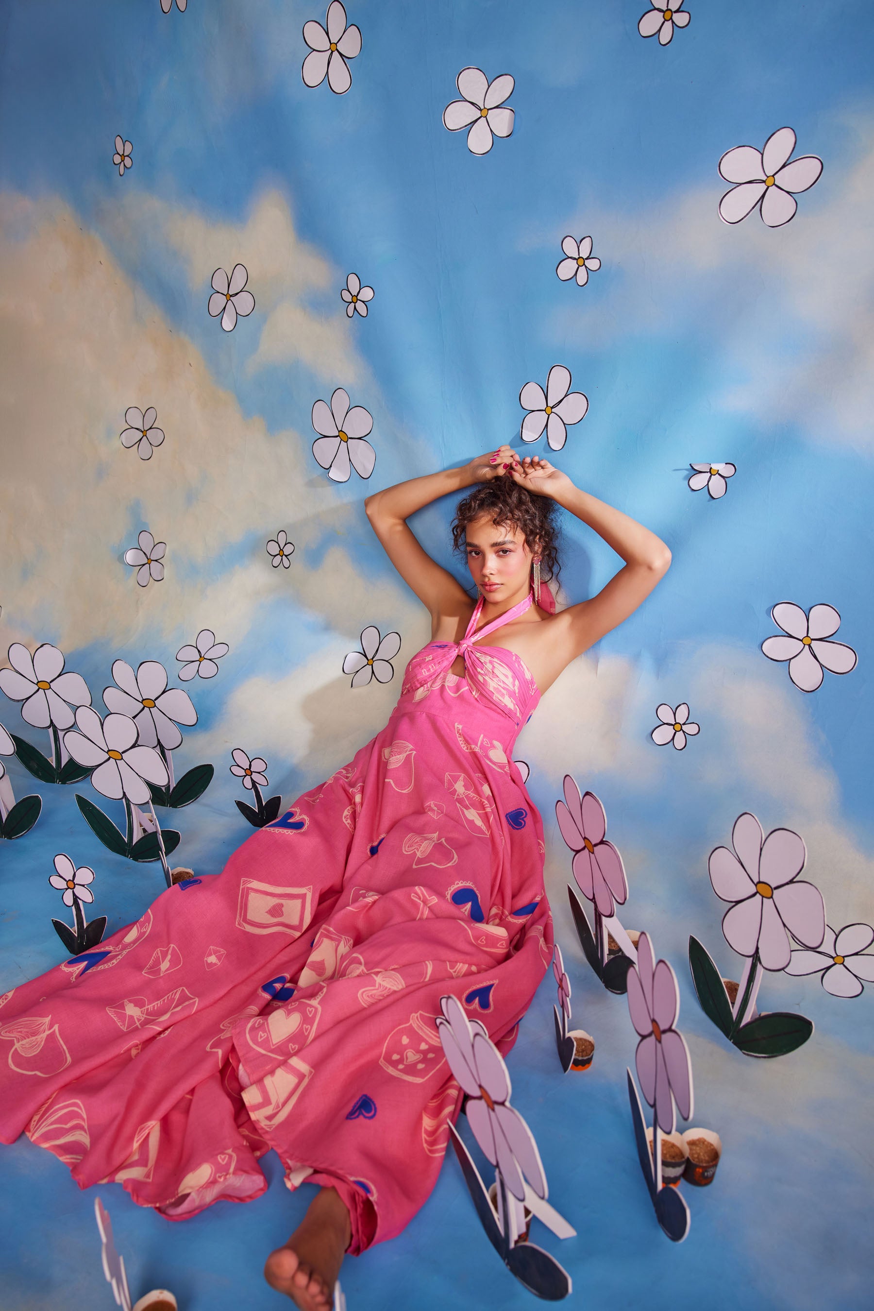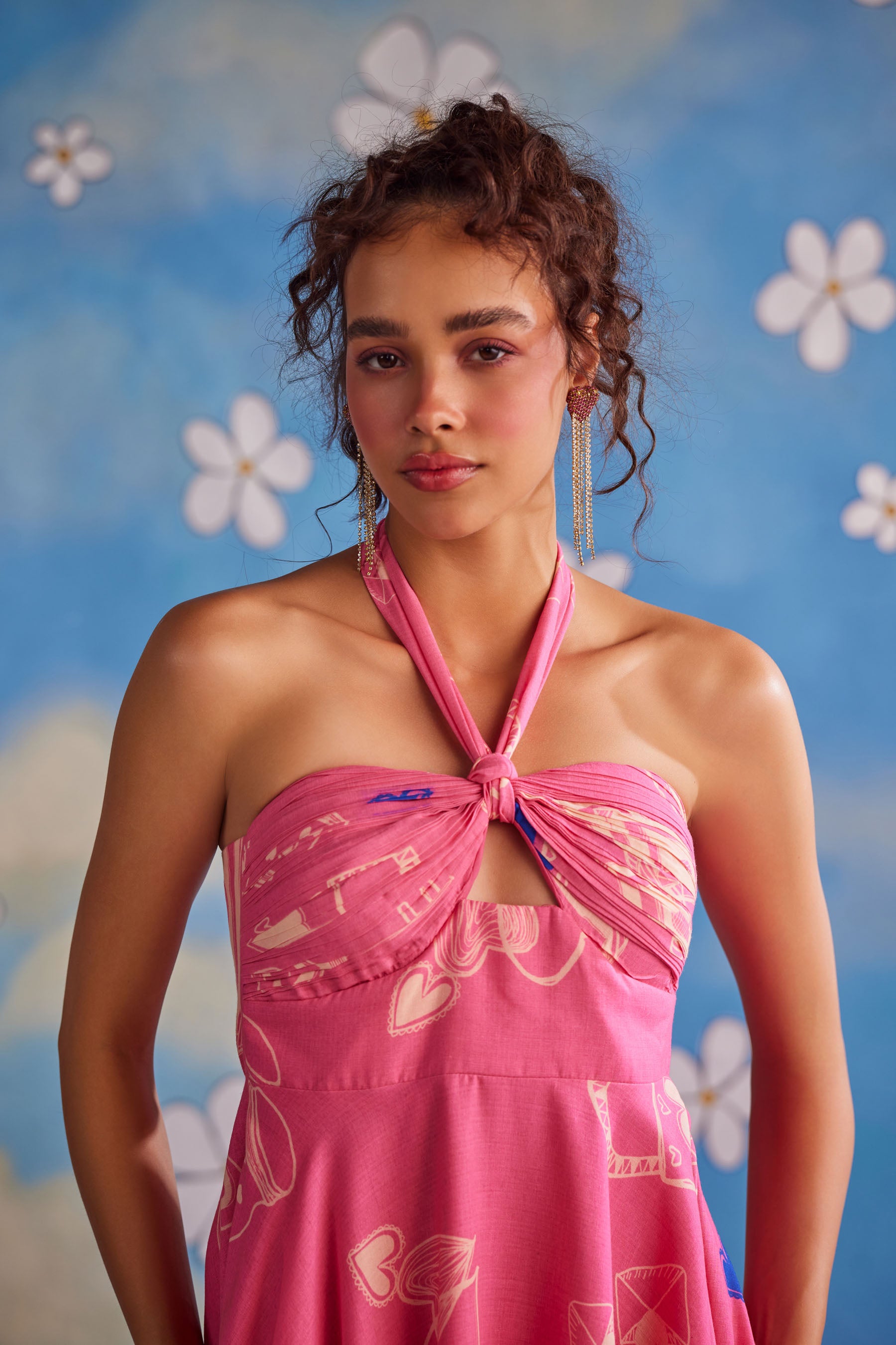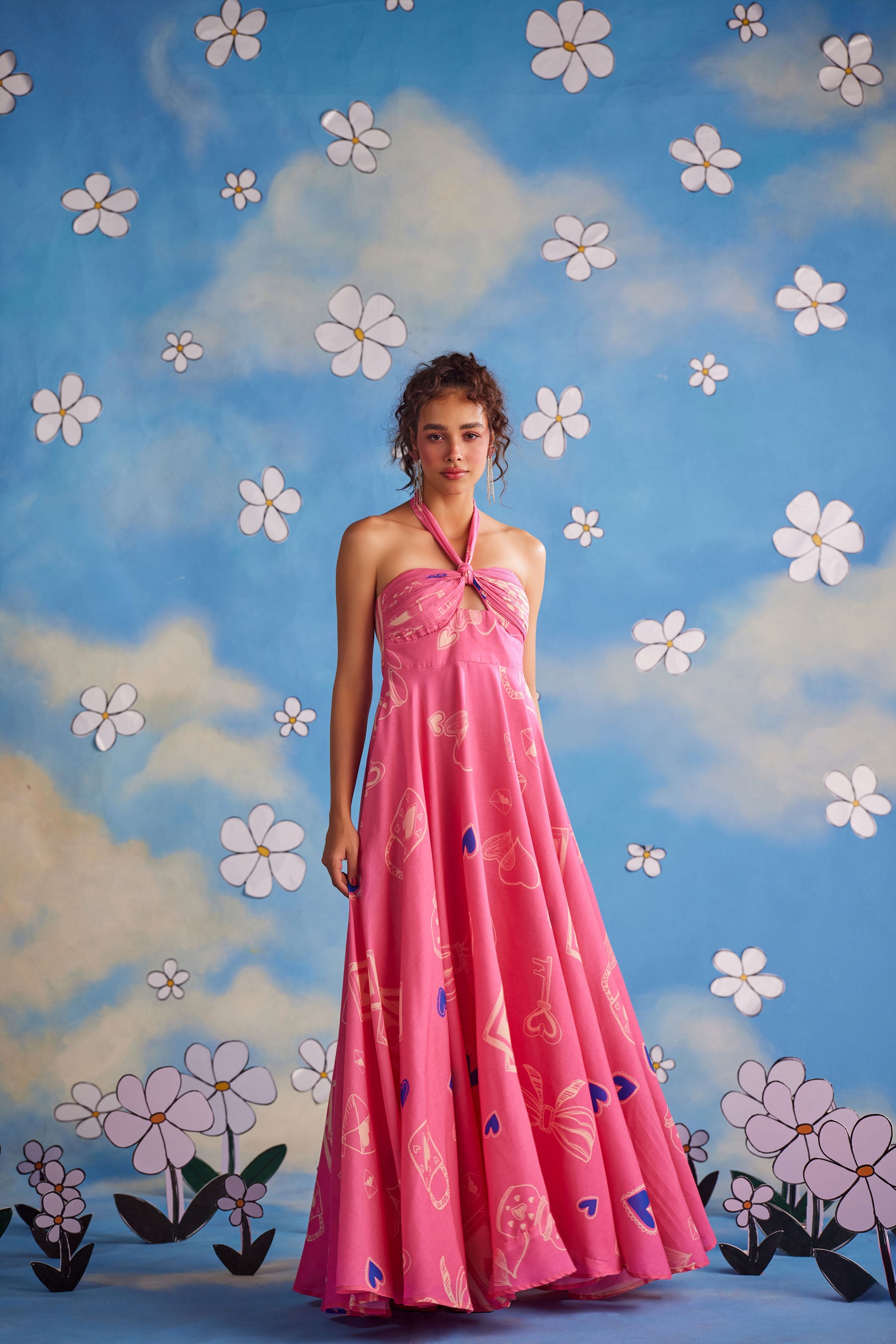 The long dress embodies the spirit of spring time romance! Crafted in fabric , the dress features flattering halter neckline with a cutout at the center to add the touch of whimsy. Dipped in pleasing pastel pink , this dress cascades down to an ankle grazing length.This dress offers a modern twist to timeless silhouette.