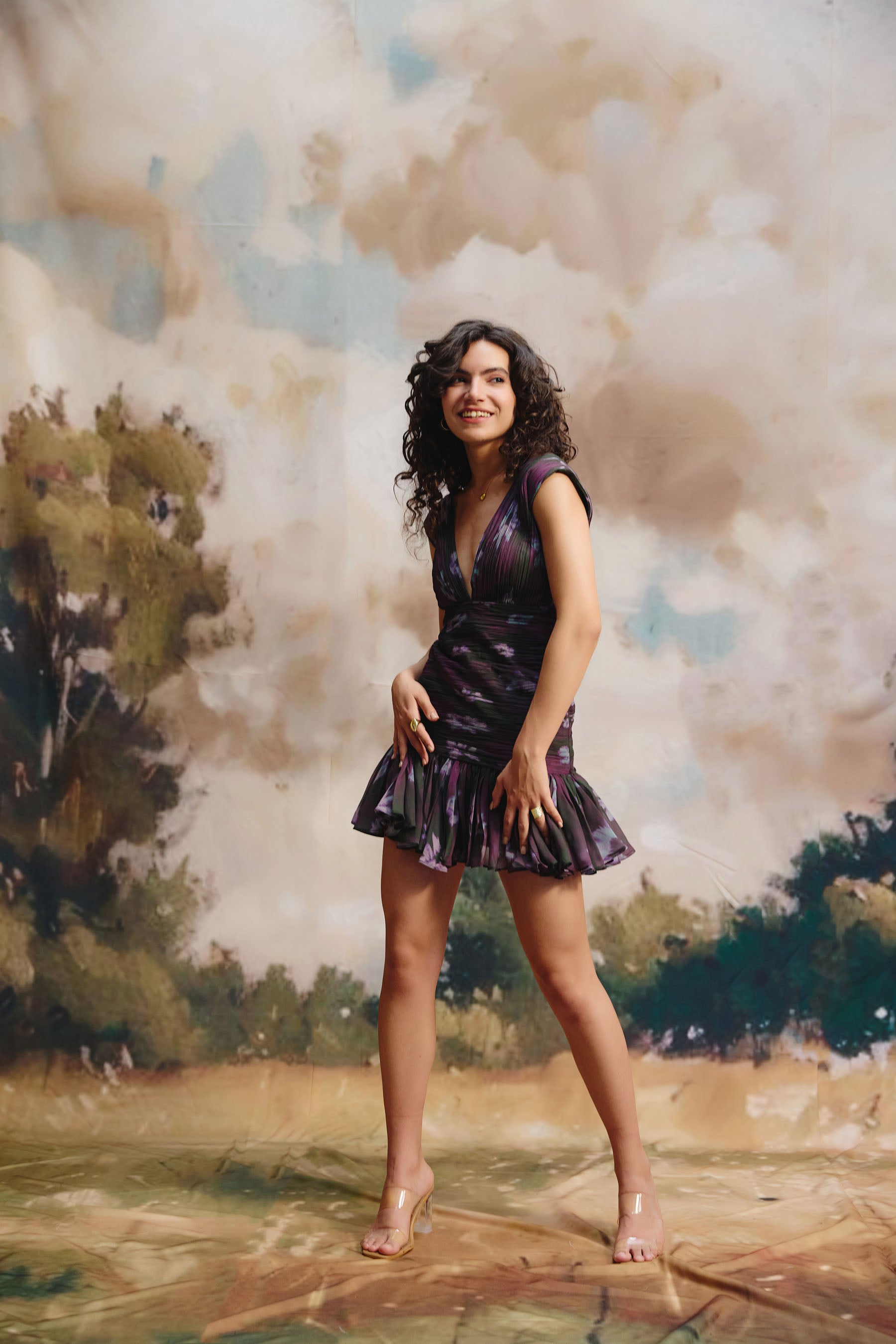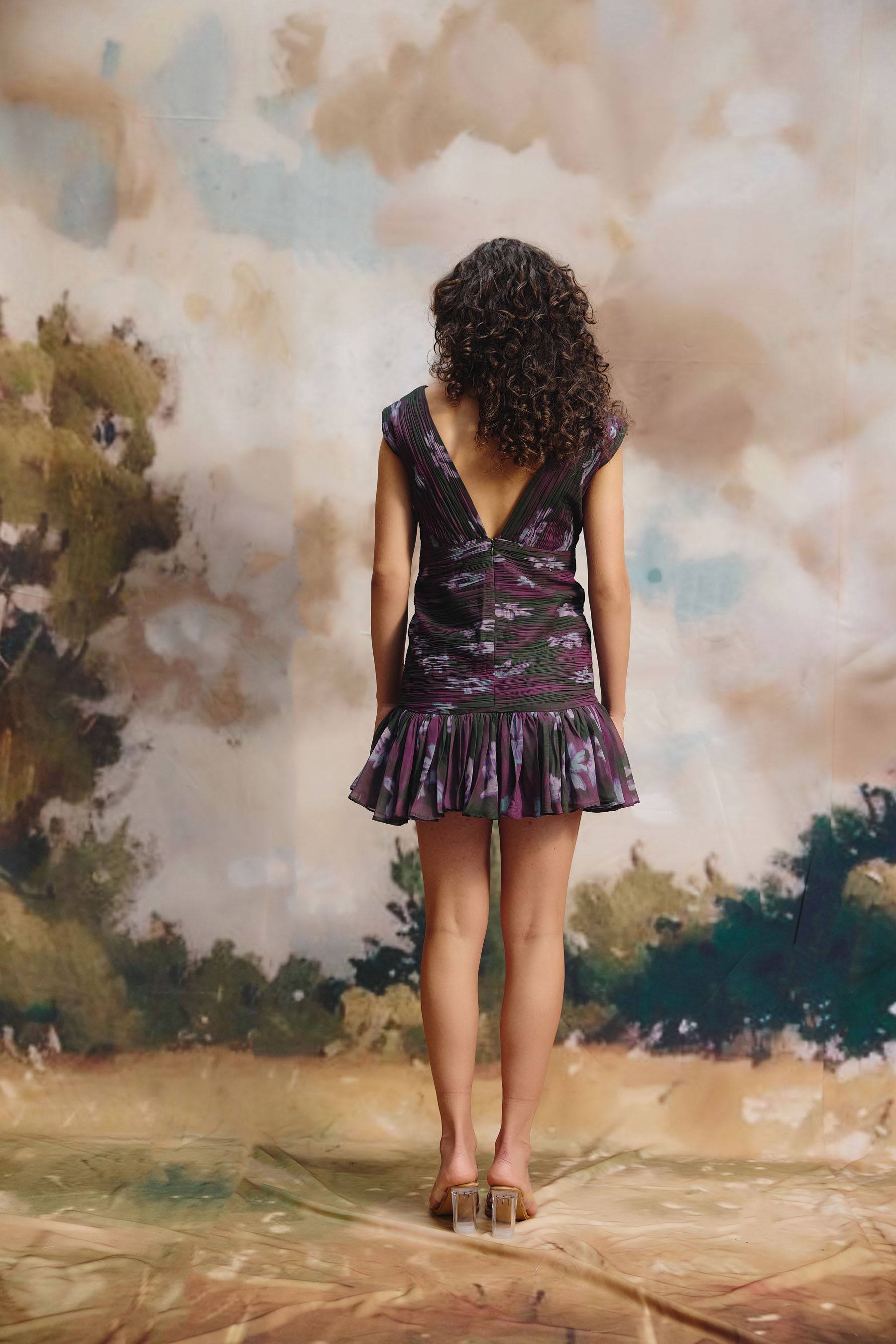 Crafted from a fitted fabric, this sleeveless mini dress features a deep V-neckline and a ruffled hem. The purple and green base with light purple floral accents adds a playful charm, perfect for a night out or a stylish party.