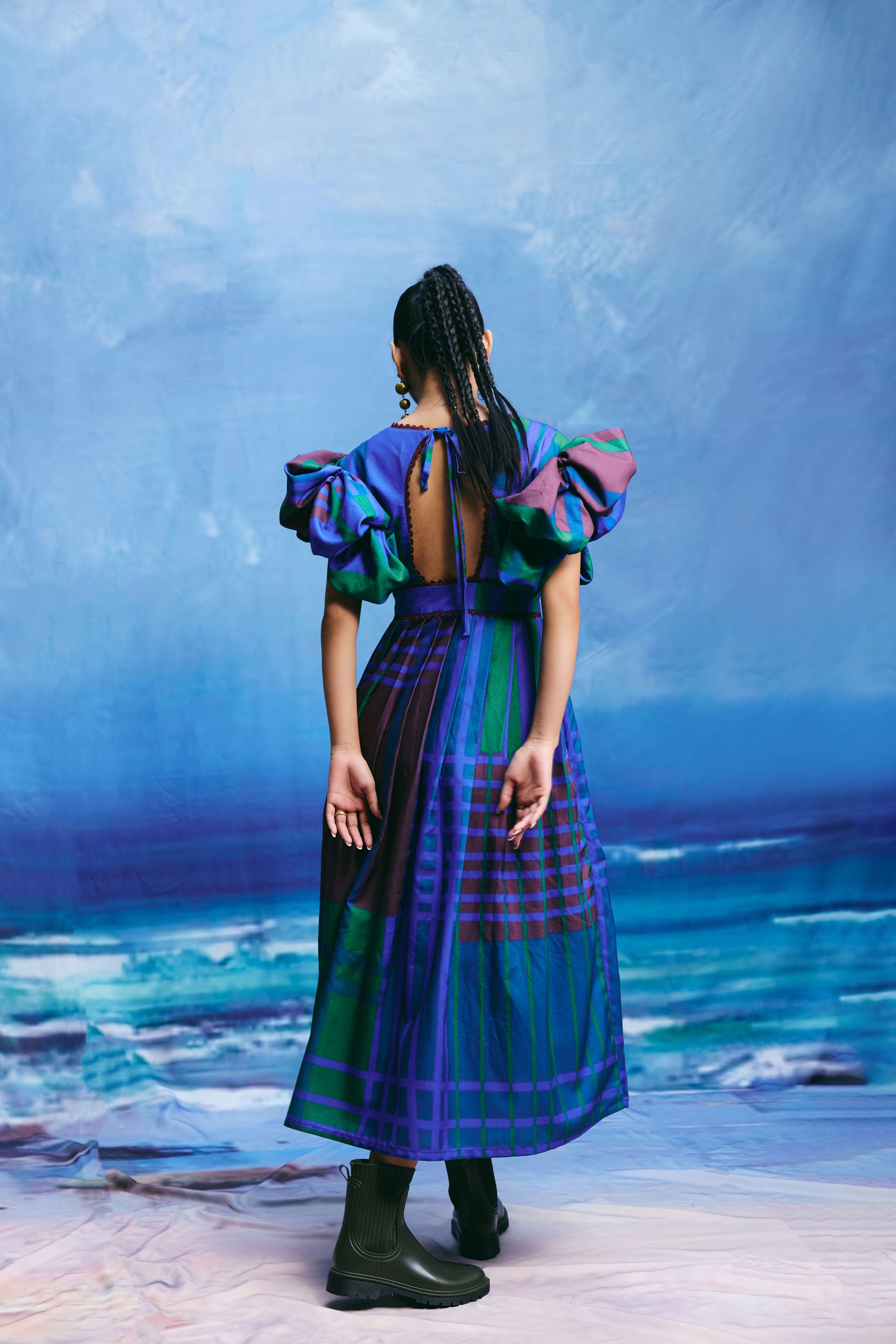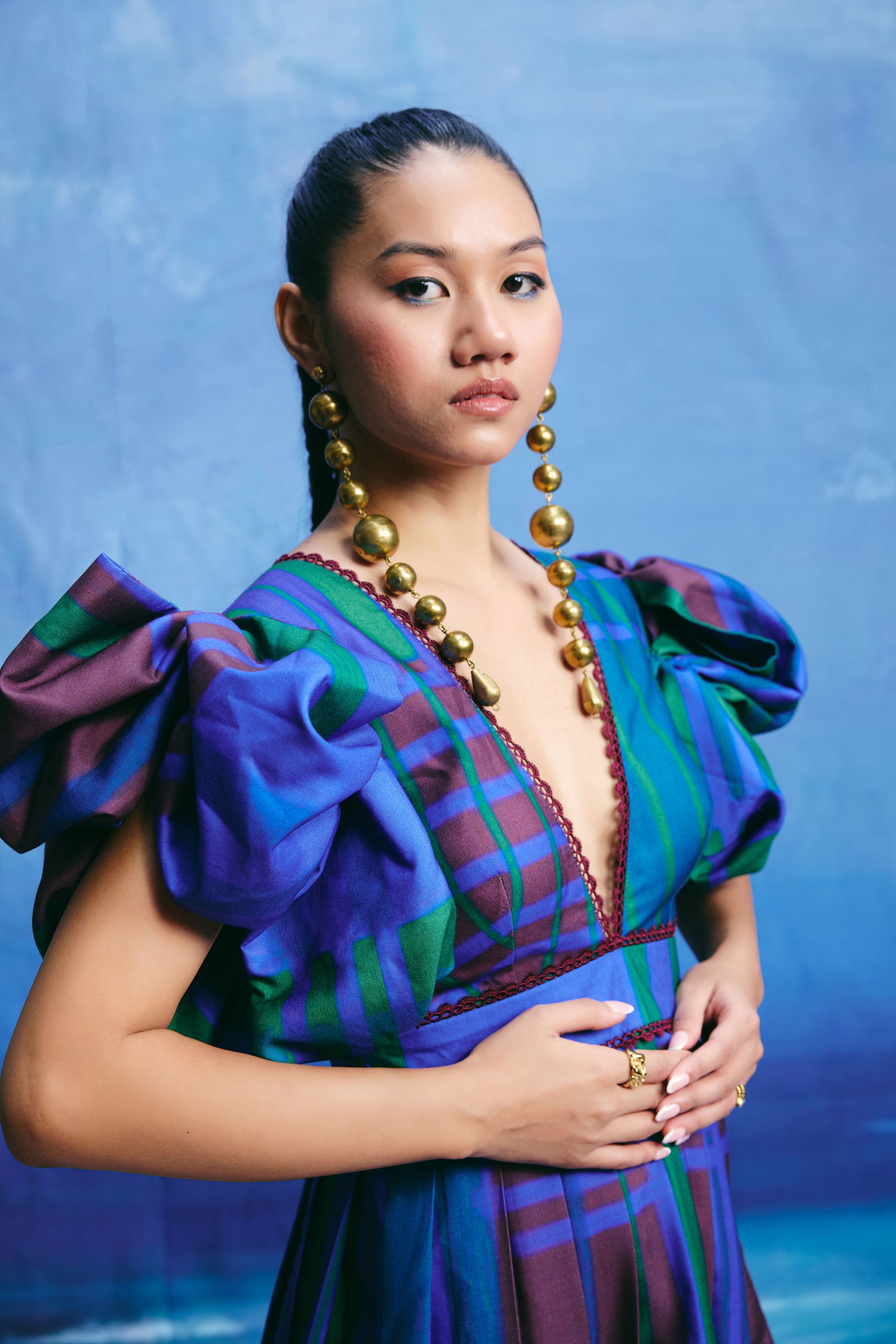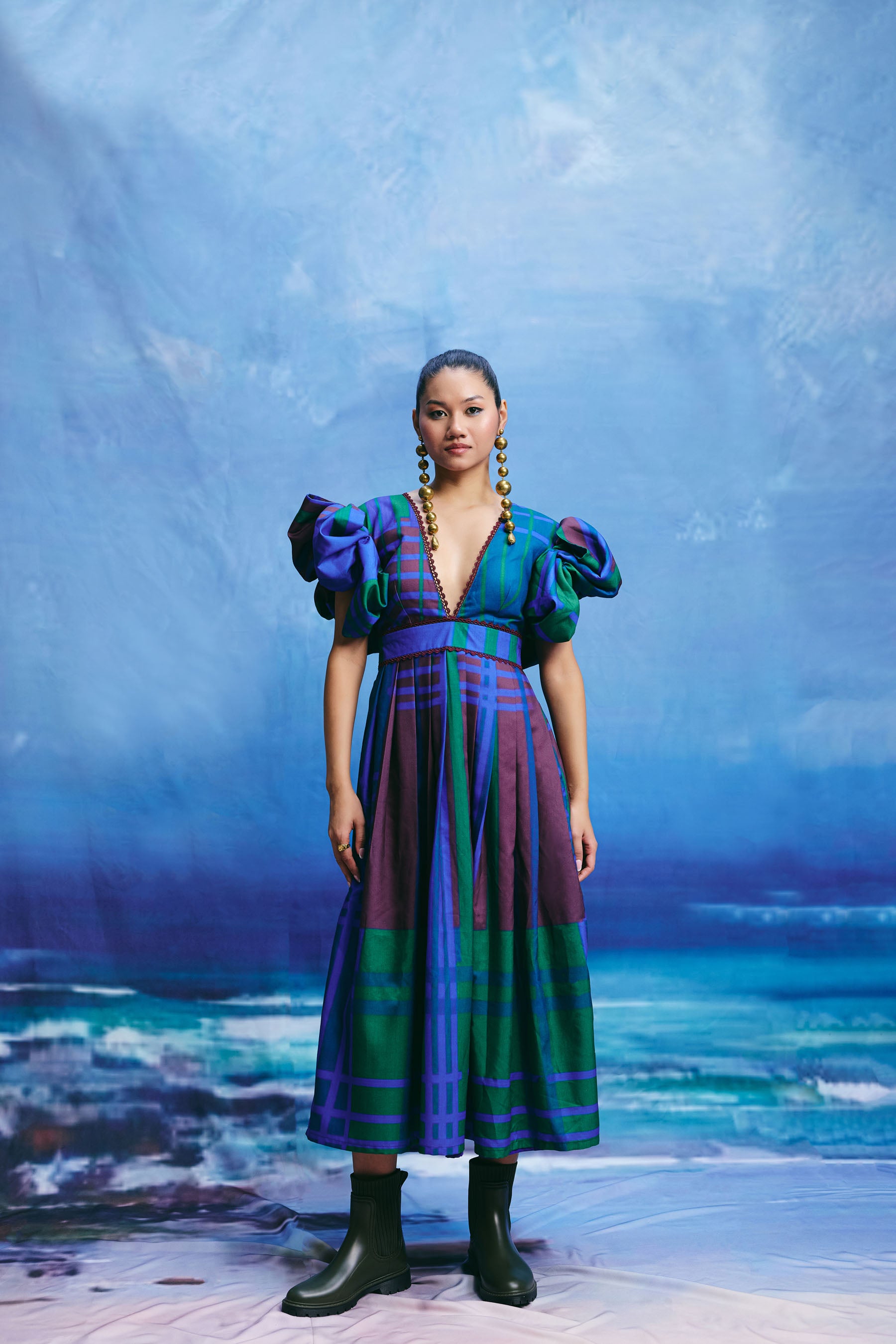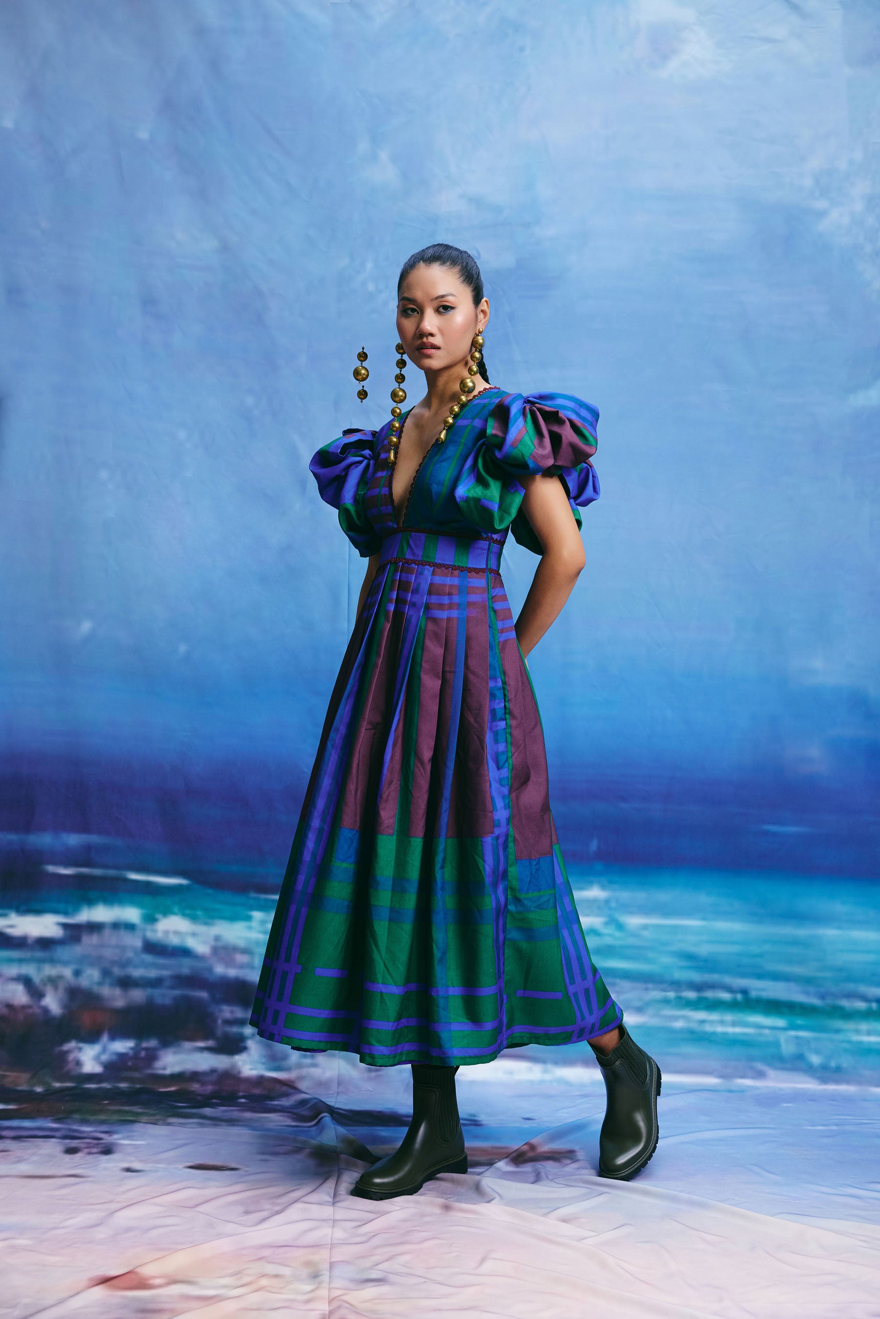 This striking dress redefines elegance with its sculpted puff sleeves and plunging V-neckline framed by delicate beaded edging. The cinched waist highlights the form, while sharp pleats flow into a flared midi-length skirt, creating structure and movement. Rendered in bold jewel shades of green, blue, and plum, this piece blends playful volume with timeless sophistication, perfect for evening occasions or fashion-forward celebrations