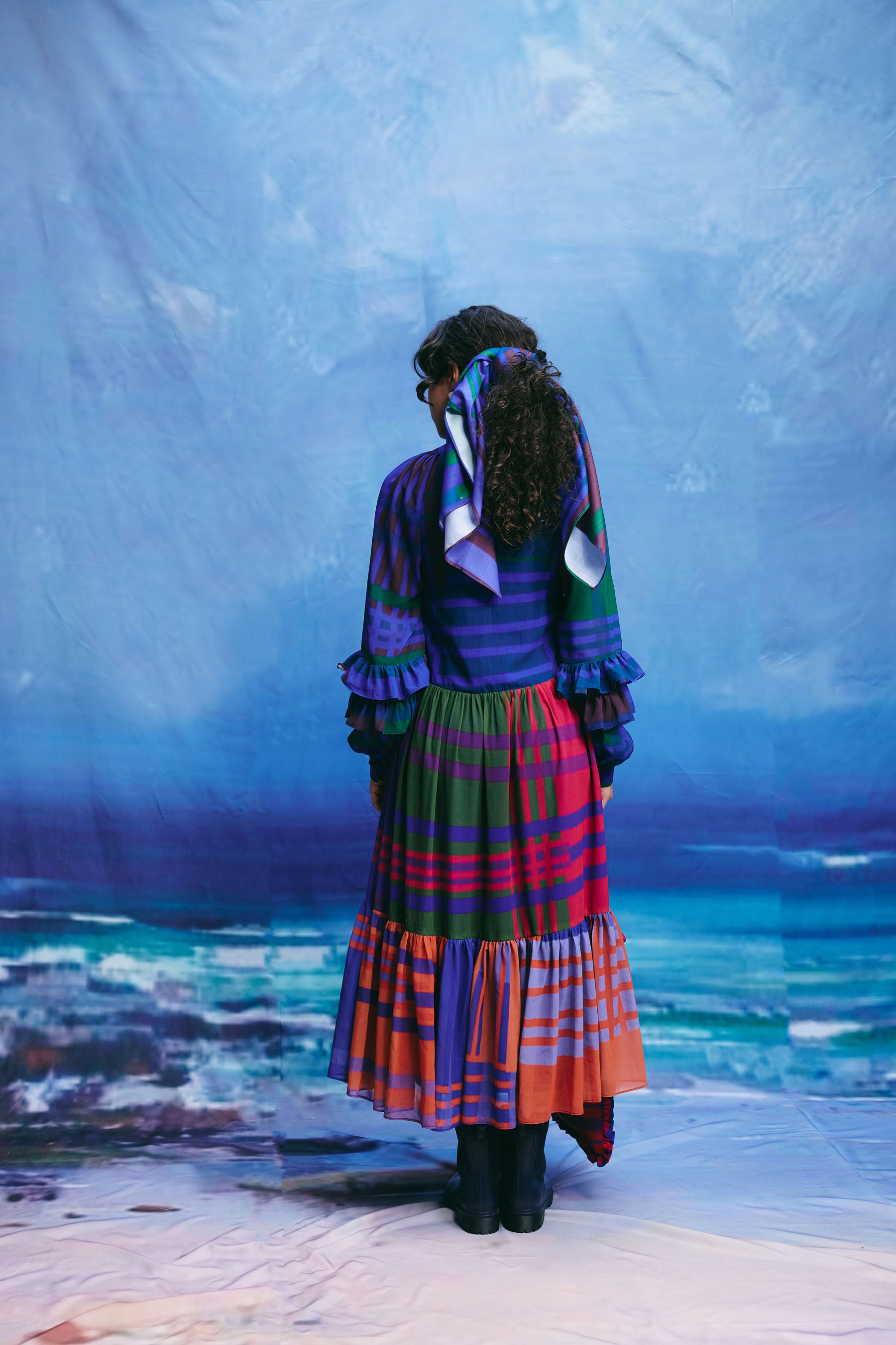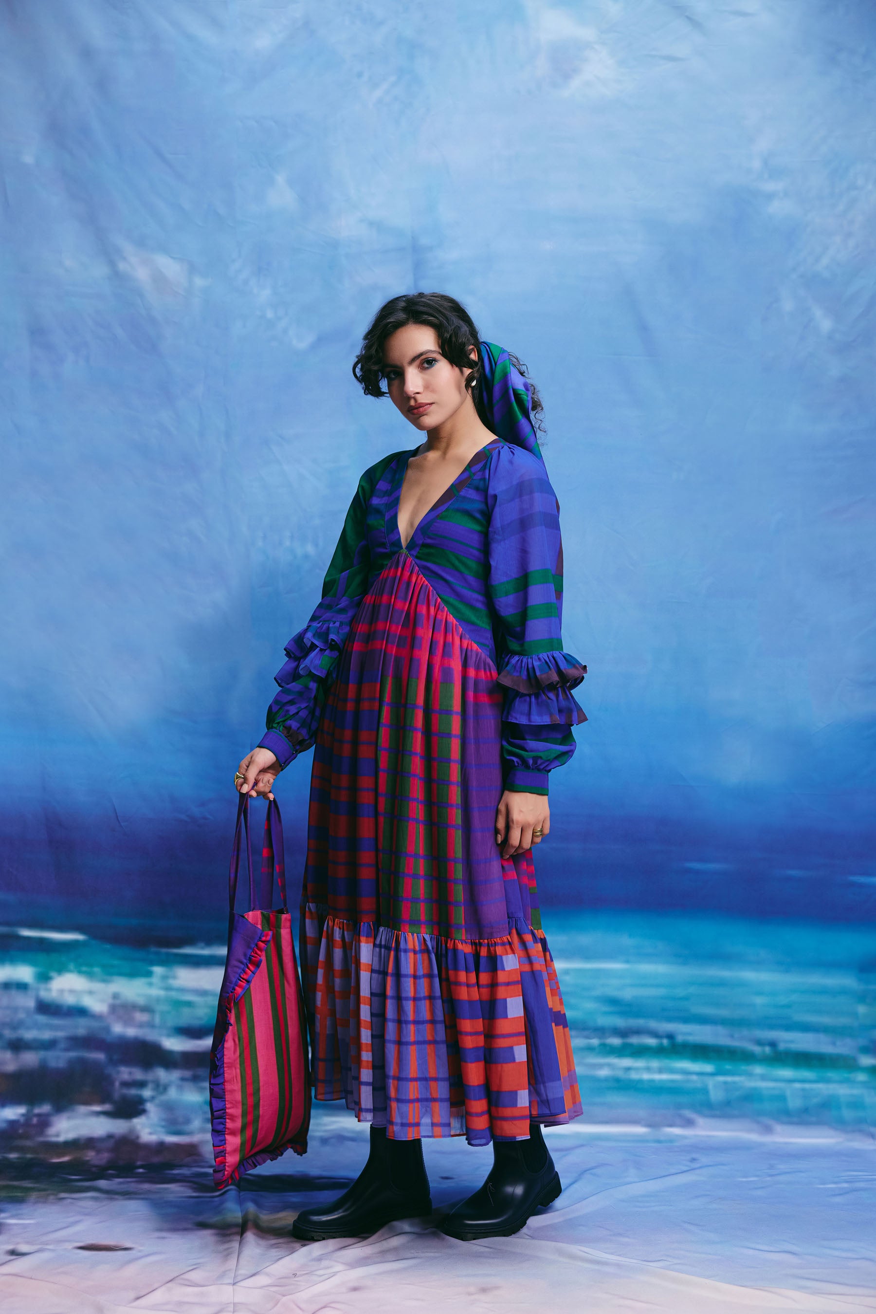 This flowing midi dress pairs a deep V-neckline with voluminous long sleeves, finished with gathered cuffs for a romantic touch. The empire waistline creates a flattering silhouette, allowing the skirt to cascade gracefully with vibrant stripes and checks in jewel tones. The relaxed yet refined design offers both comfort and drama, making it a versatile choice for soirées, festive gatherings, or statement daywear.