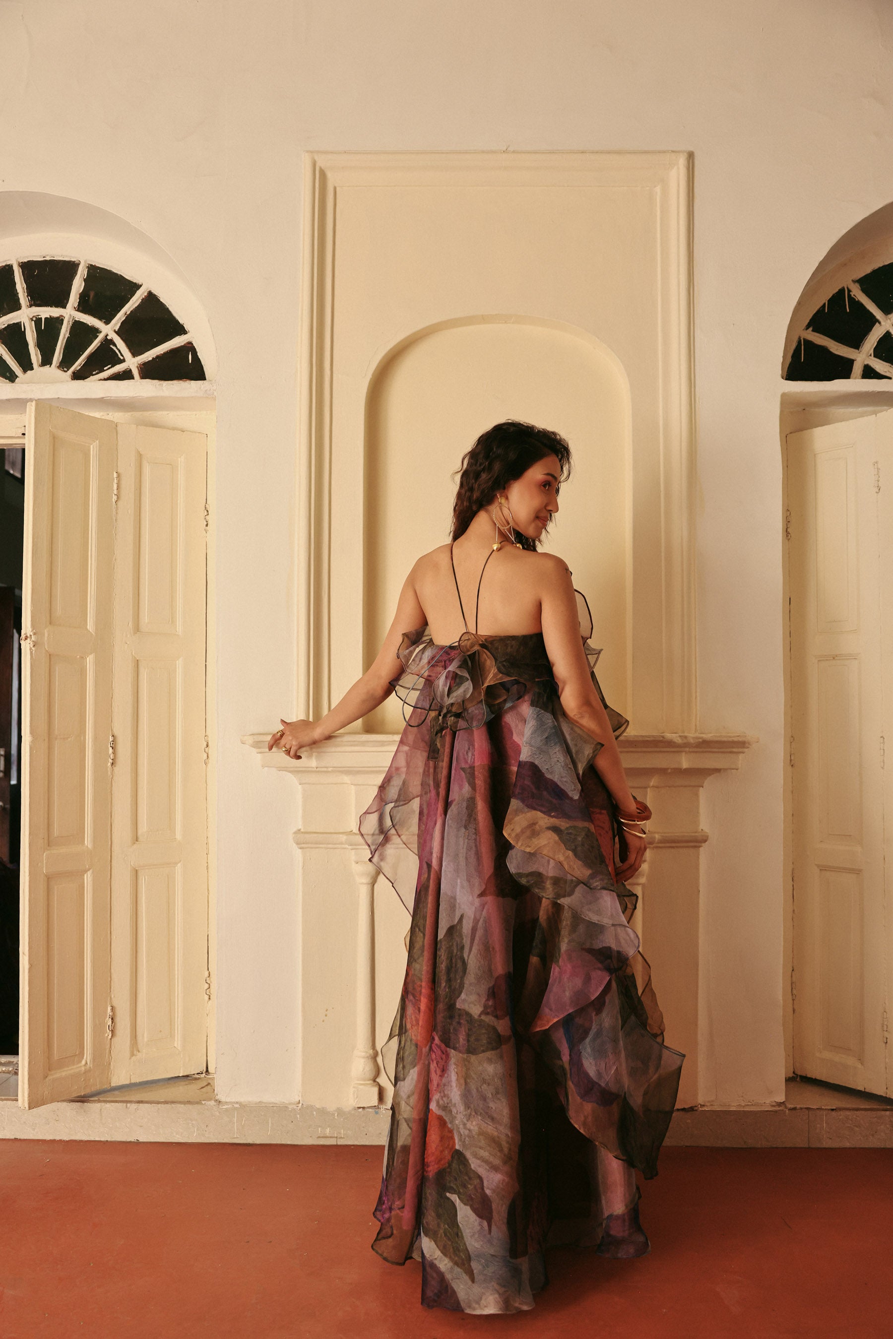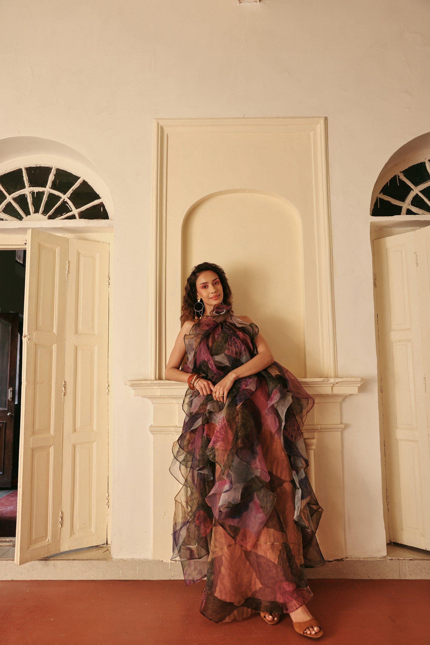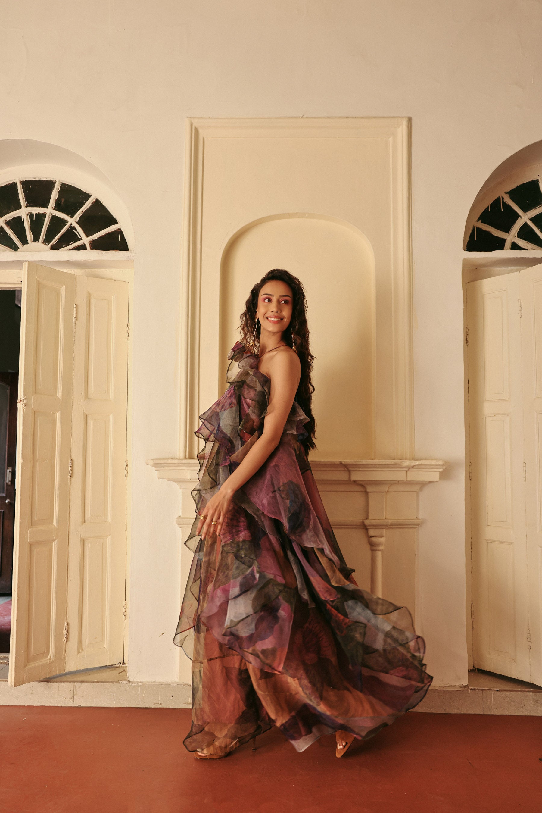 An ethereal organza gown adorned with oversized floral prints in rich plum and earthy tones. Featuring soft cascading ruffles and a statement rosette neckline, it flows effortlessly for a dreamy, romantic silhouette.