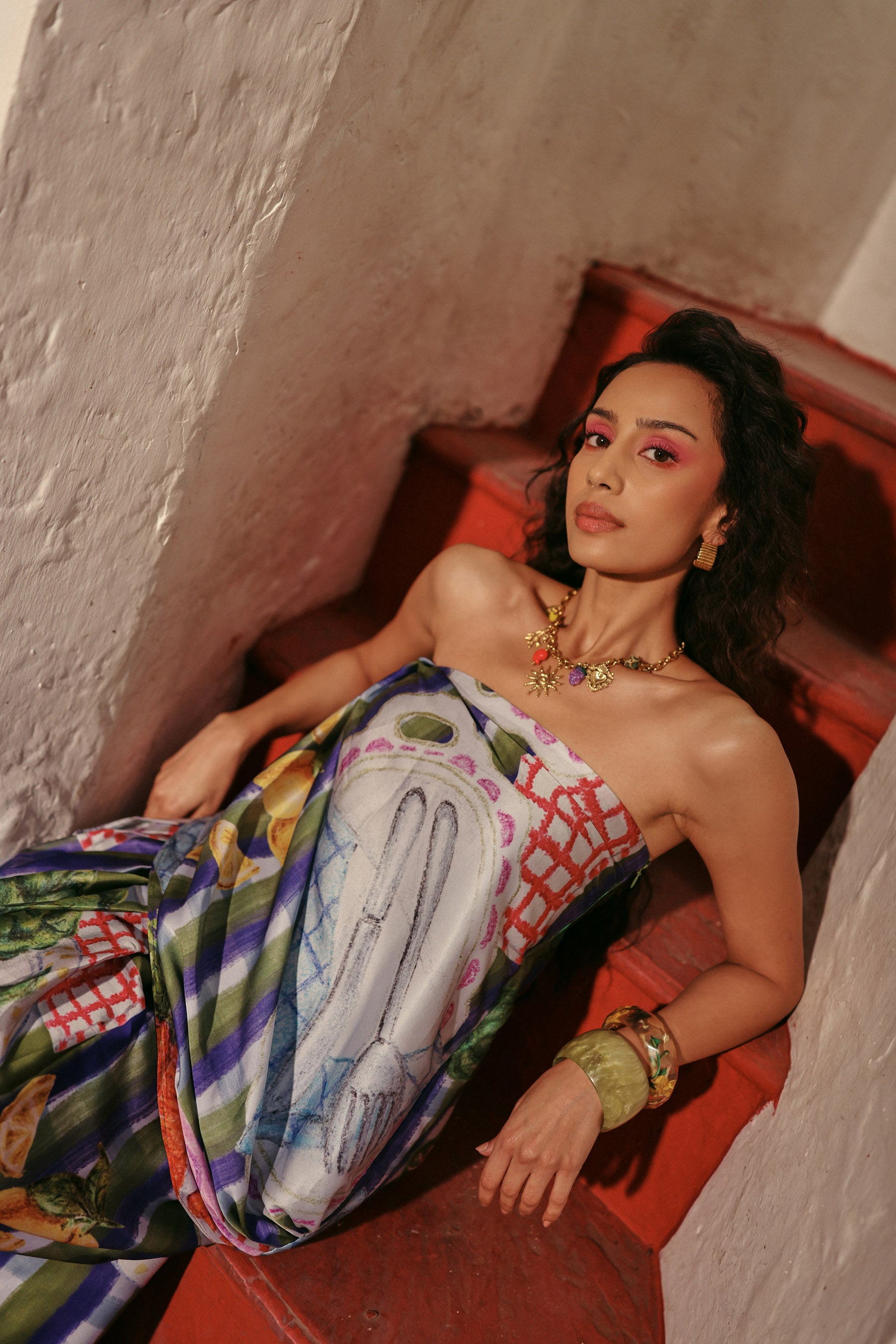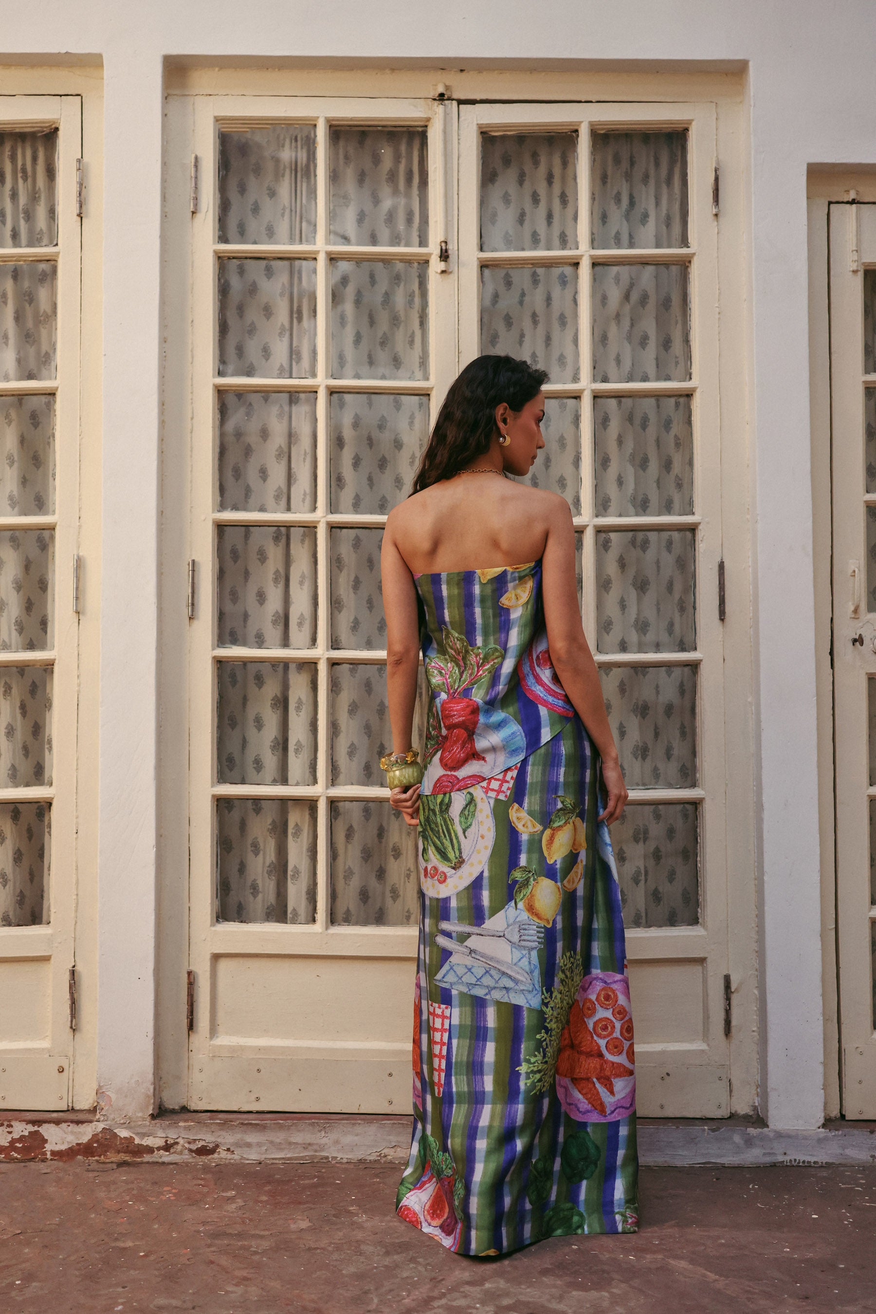 A strapless printed tube top featuring soft pastel patterns, designed for a fresh , lightweight summer look.