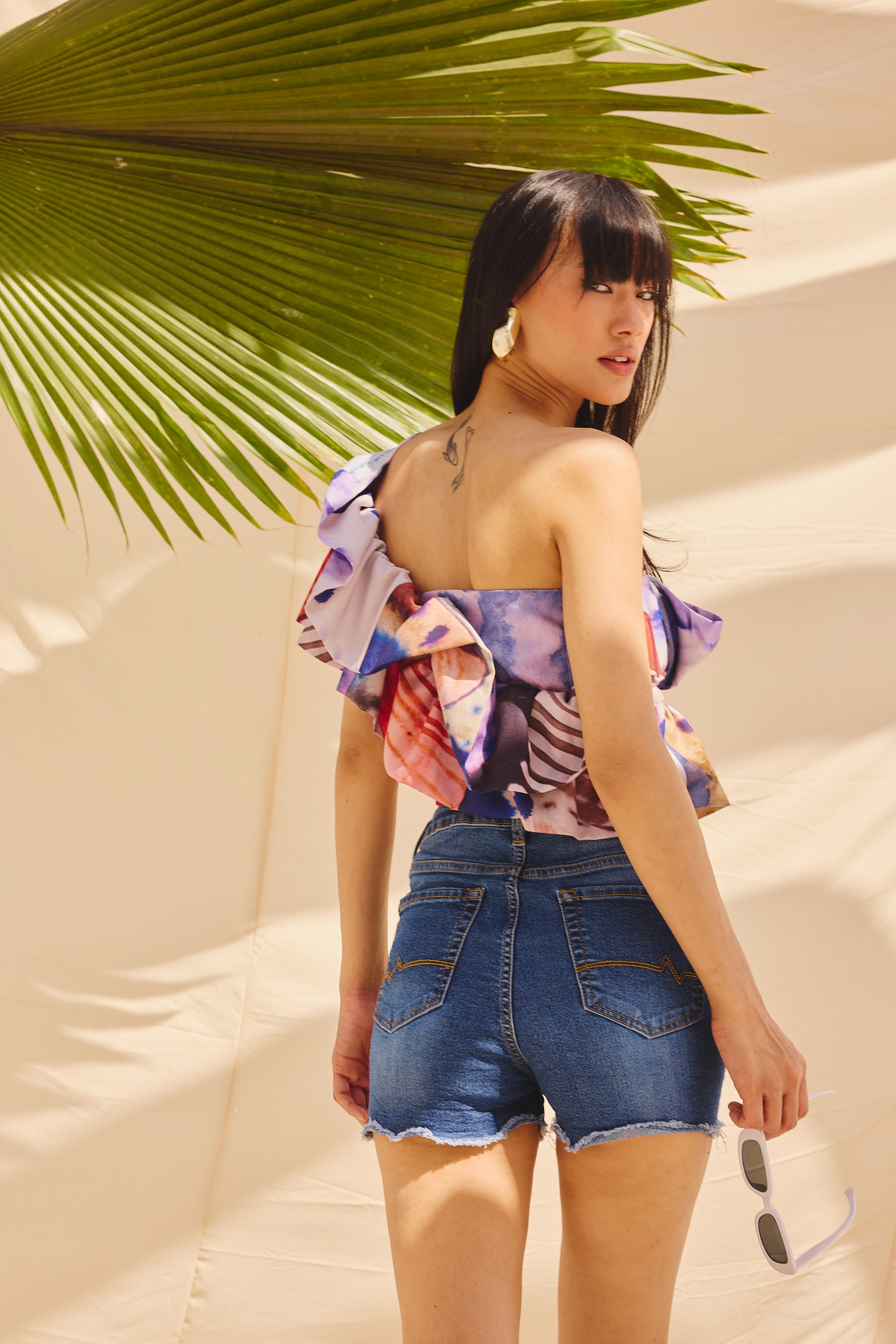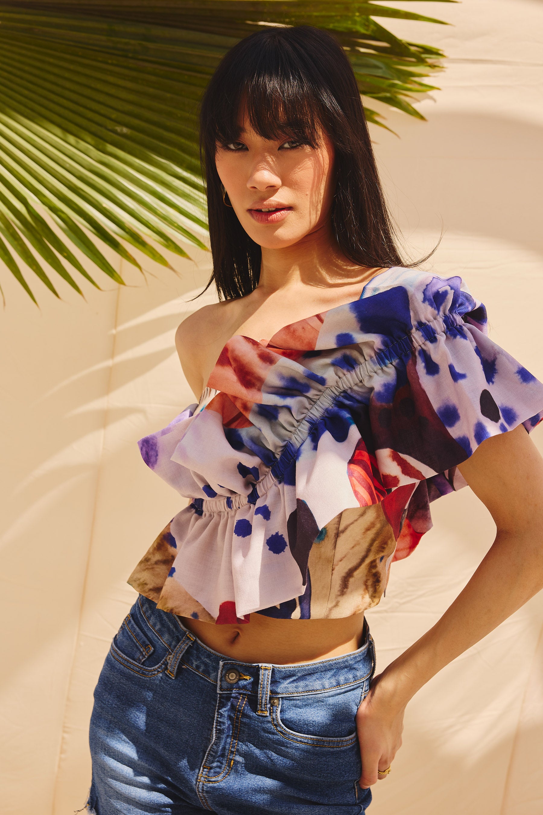 This one-shoulder top features ruffled frills along the upper part, adding a stylish and dynamic touch. The top comes in a vibrant mix of colors, with a unique one-shoulder cut that highlights the asymmetrical design. The frill detailing enhances its playful yet elegant look, making it a perfect choice for a gathering with friends or a casual evening out.