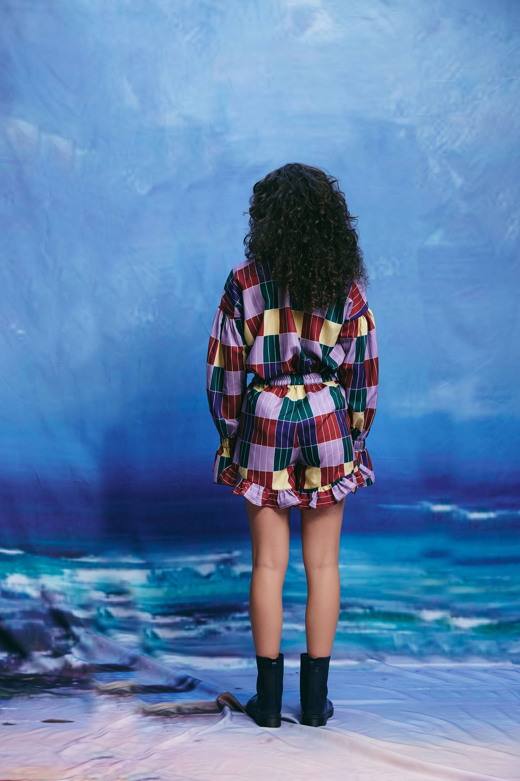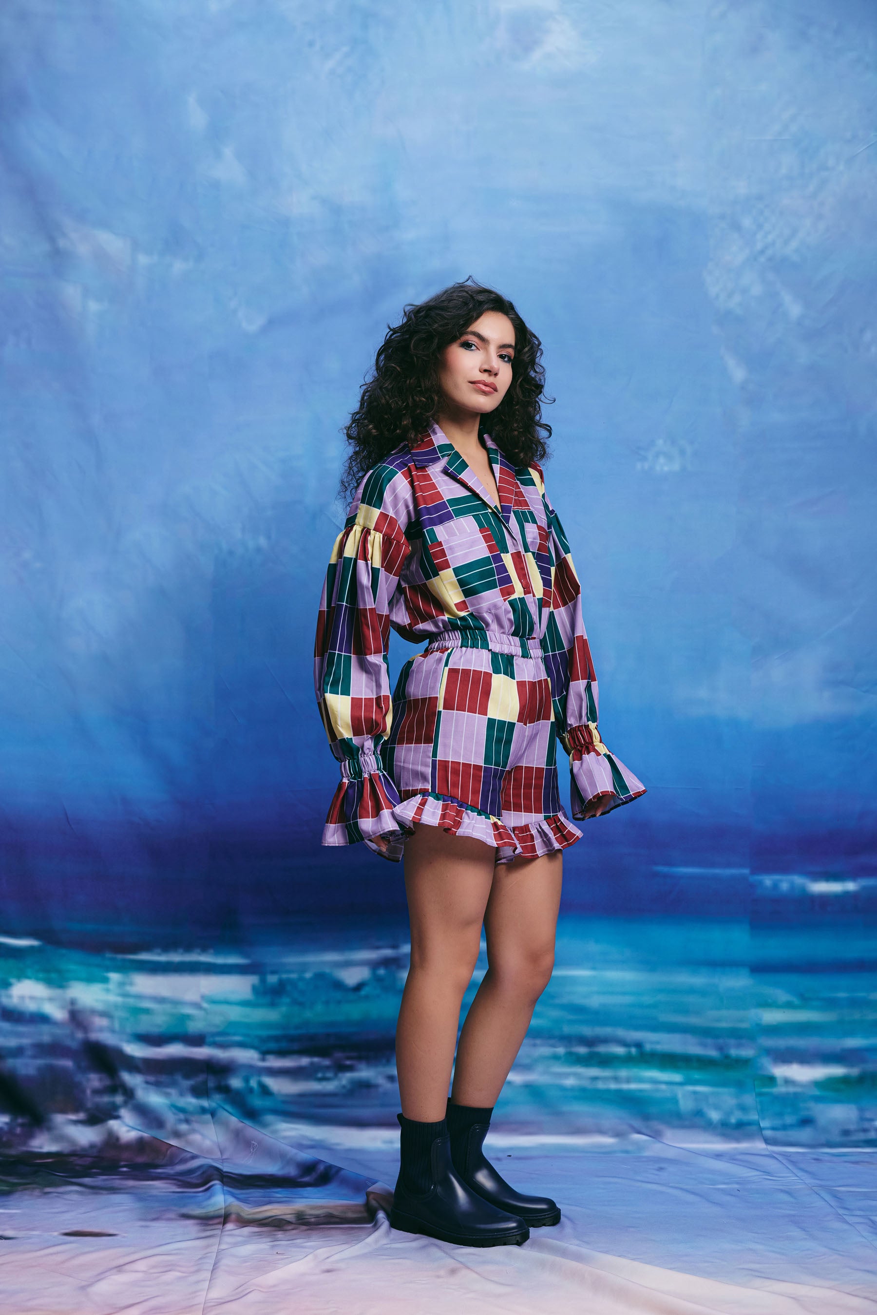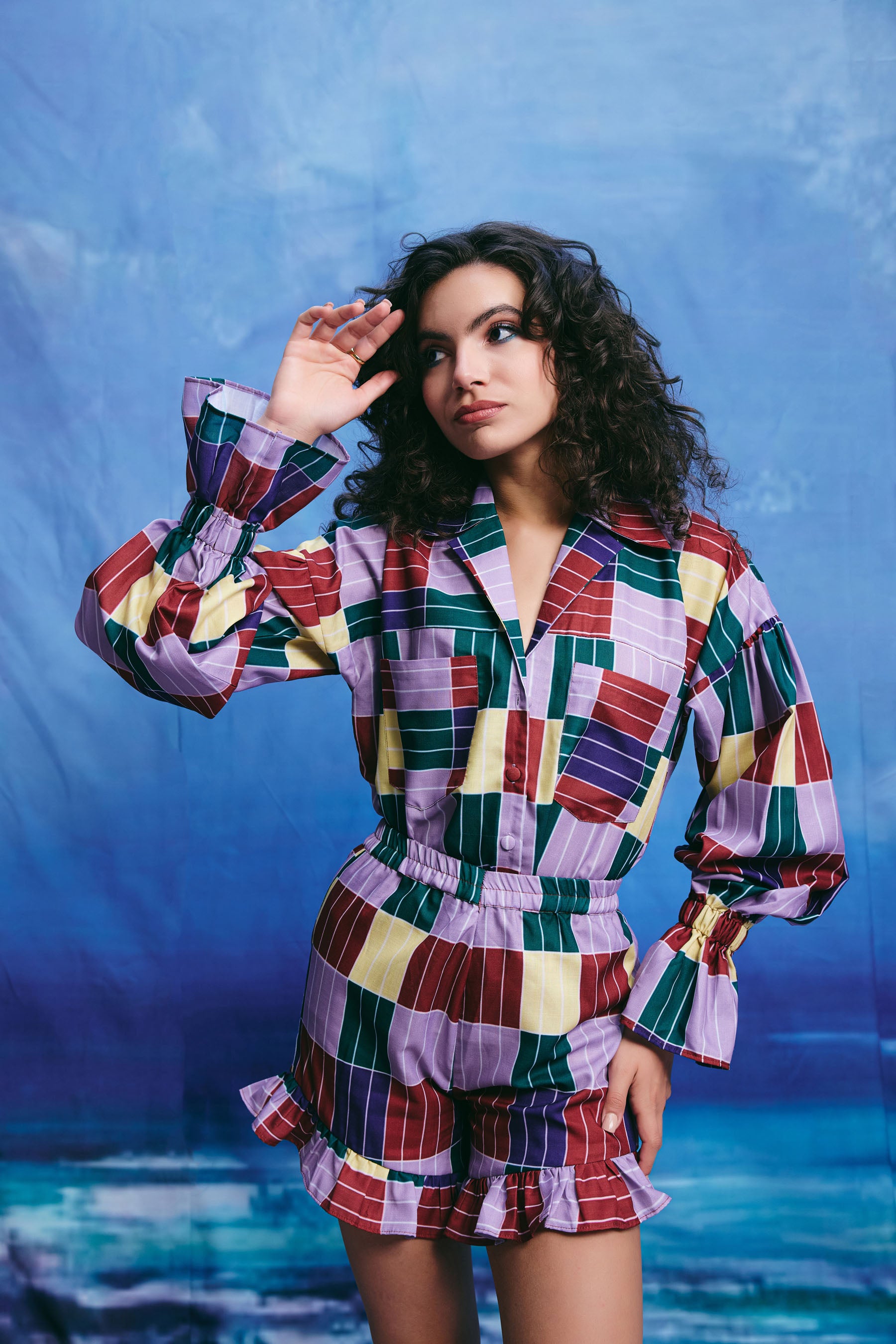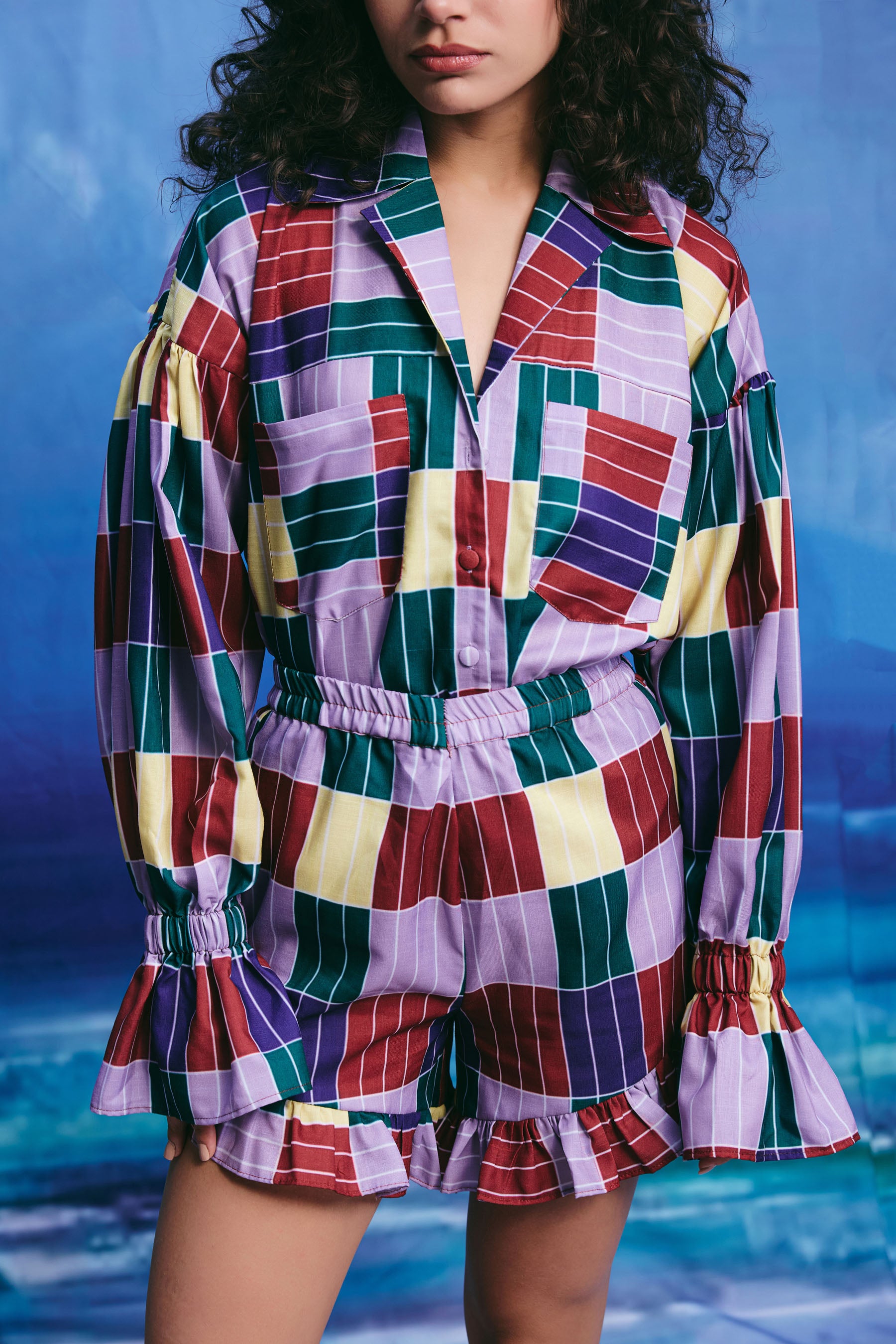 This multicolor patchwork shirt features a collar, buttons down the front, and puffy sleeves with ruffles at the ends. The shirt is made up of squares in shades of red, green, blue, yellow, and purple with thin white stripes.