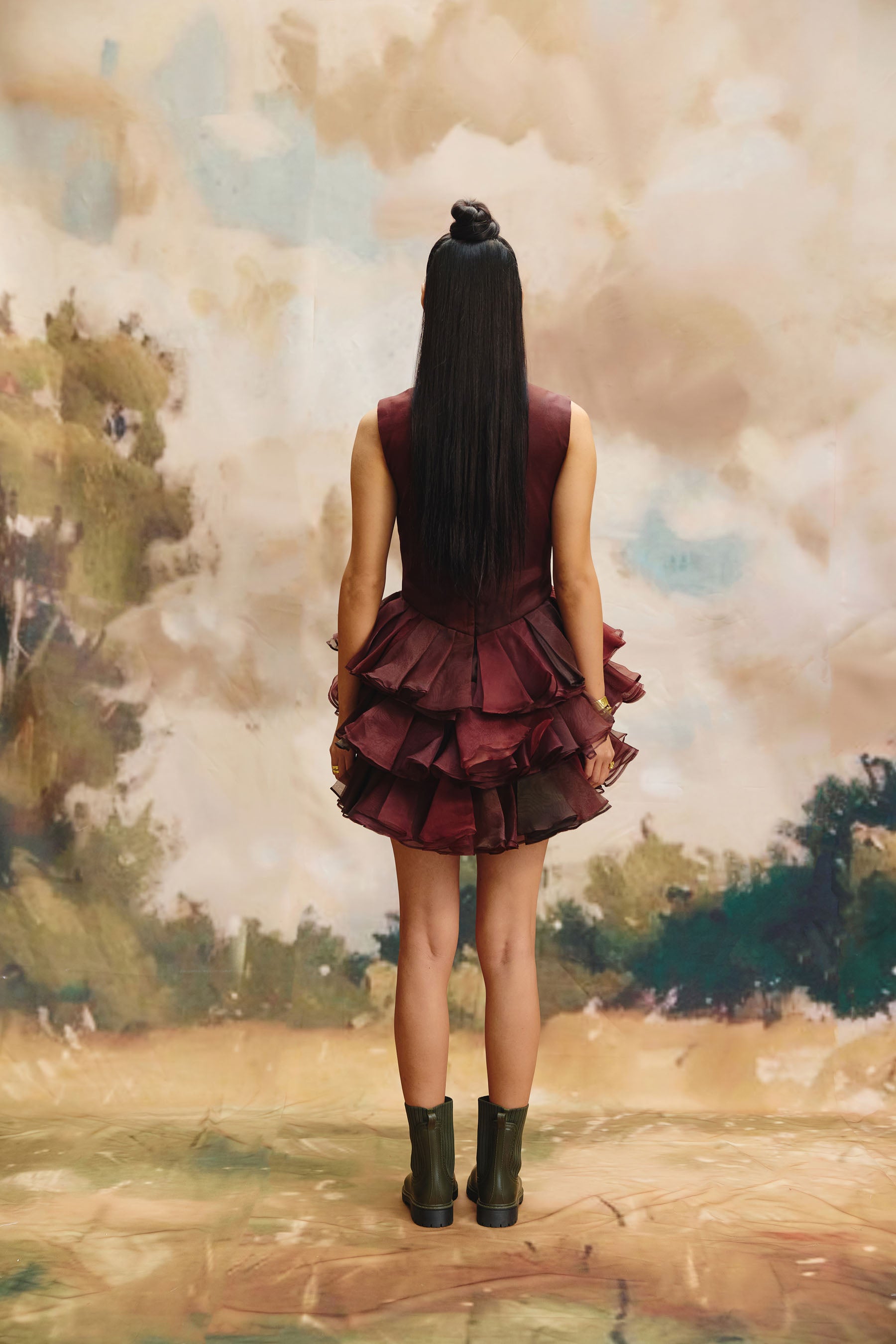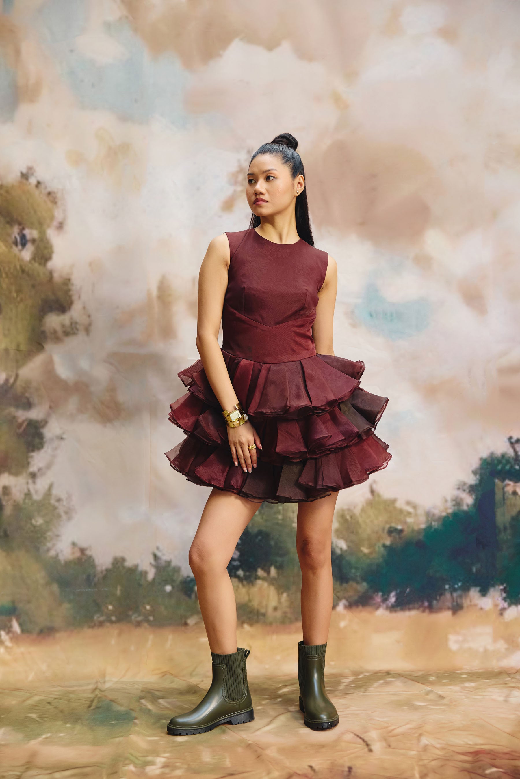 This striking, sleeveless mini-dress is crafted entirely from deep burgundy organza. It features a smooth, fitted bodice that flows seamlessly into a dramatic skirt composed of voluminous, cascading tiered ruffles, creating a single, bold, and structured silhouette.