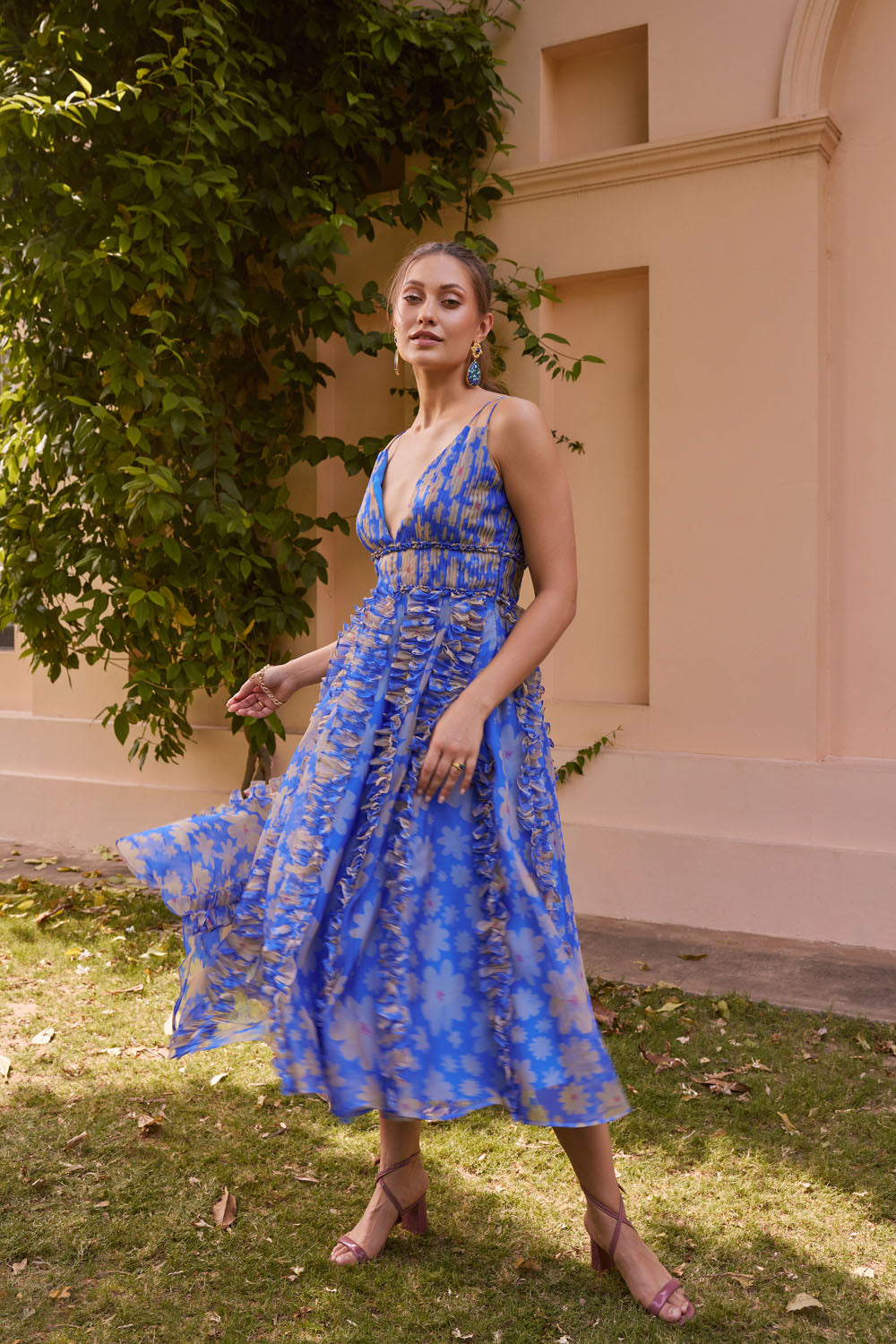 Have a look at our perfect v-neck date outfit with parallel ruffles from waist to bottom