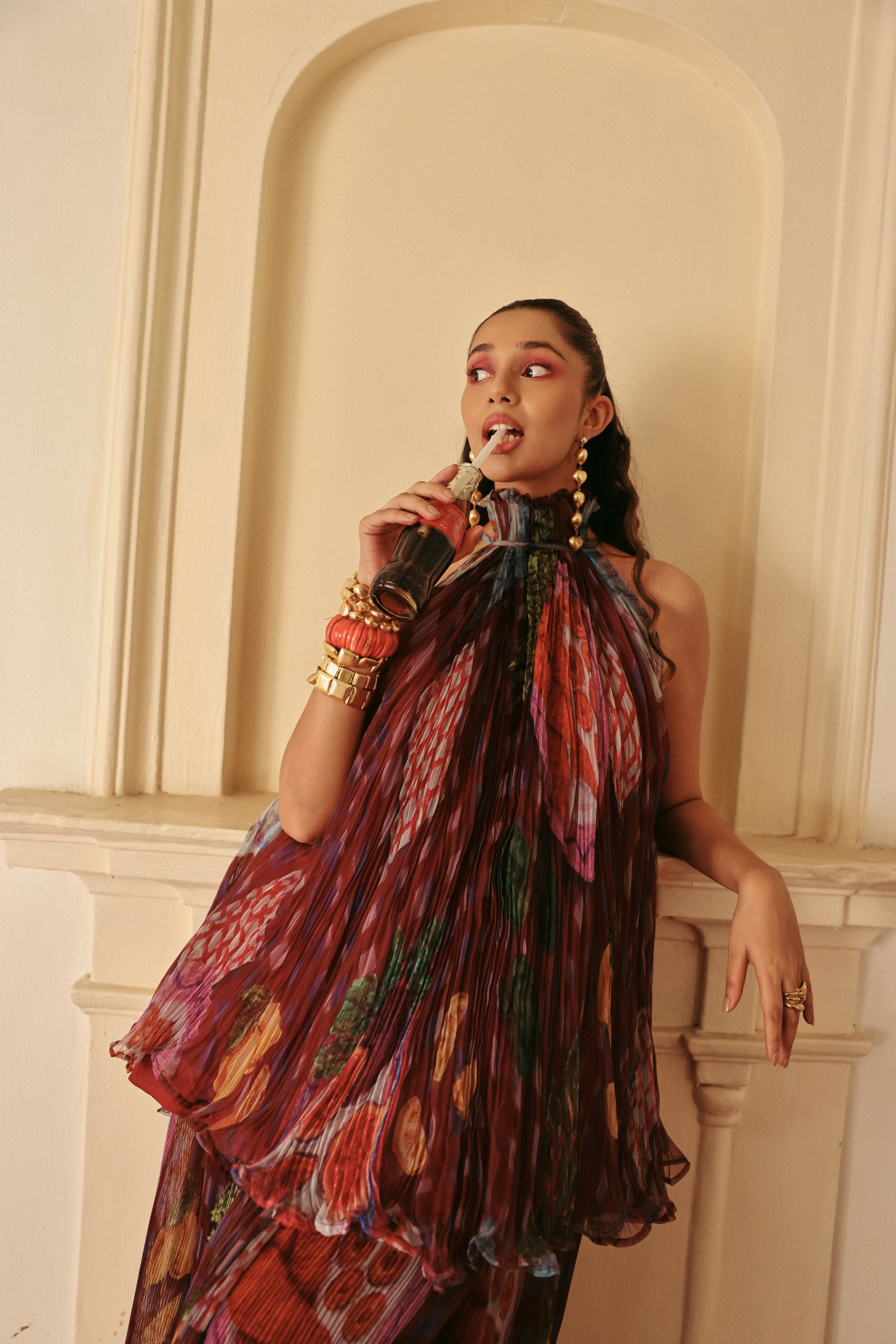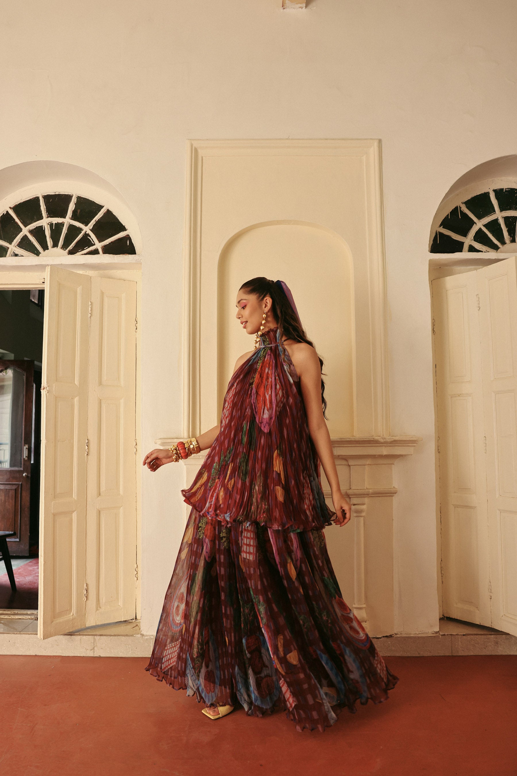 A flowy top with a pleated skirt in a rich wine hue, featuring a playful mix of checks and vibrant fruit-inspired prints. Crafted in a lightweight, breezy fabric with a gathered waistband, it moves beautifully and makes a bold yet effortless statement.