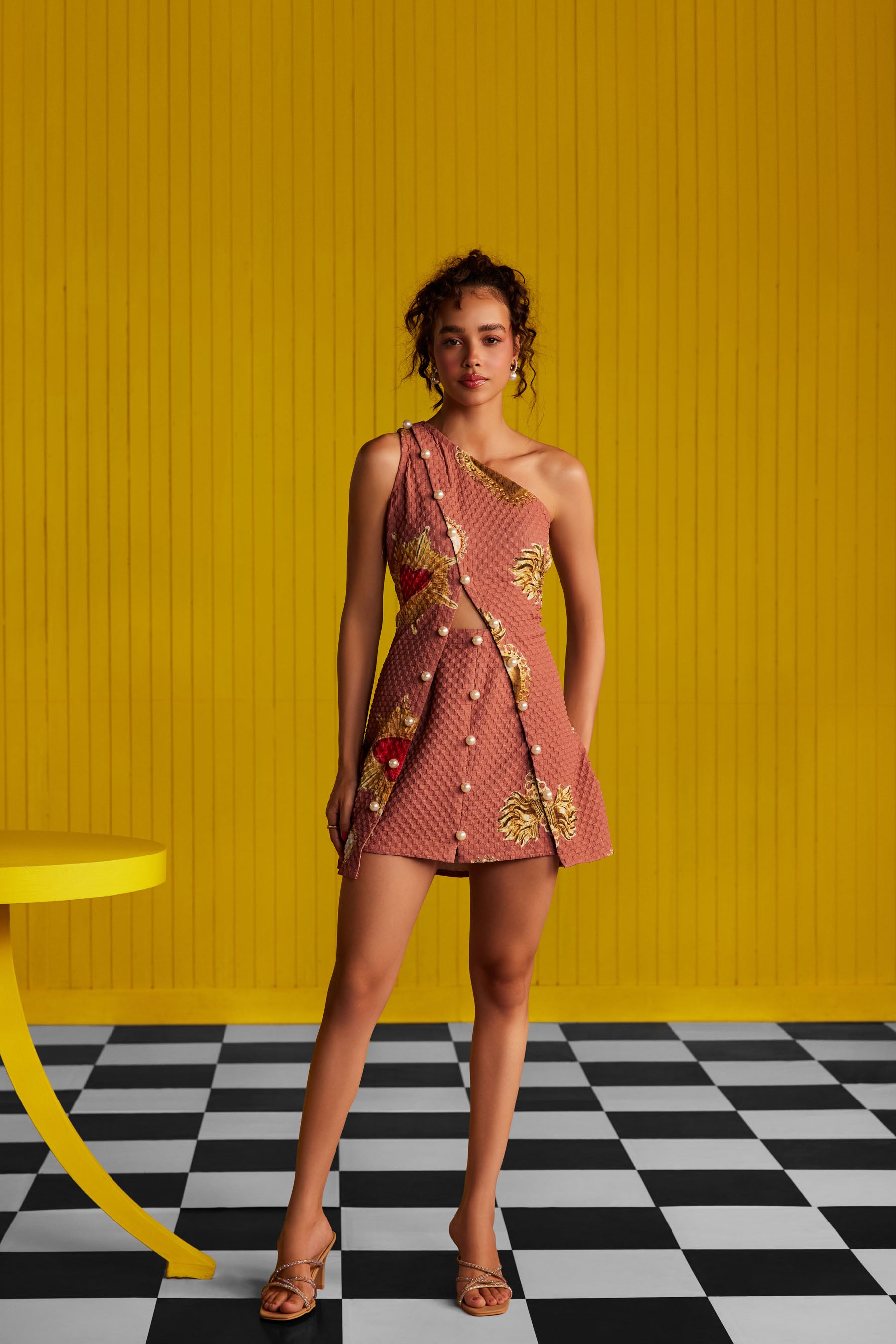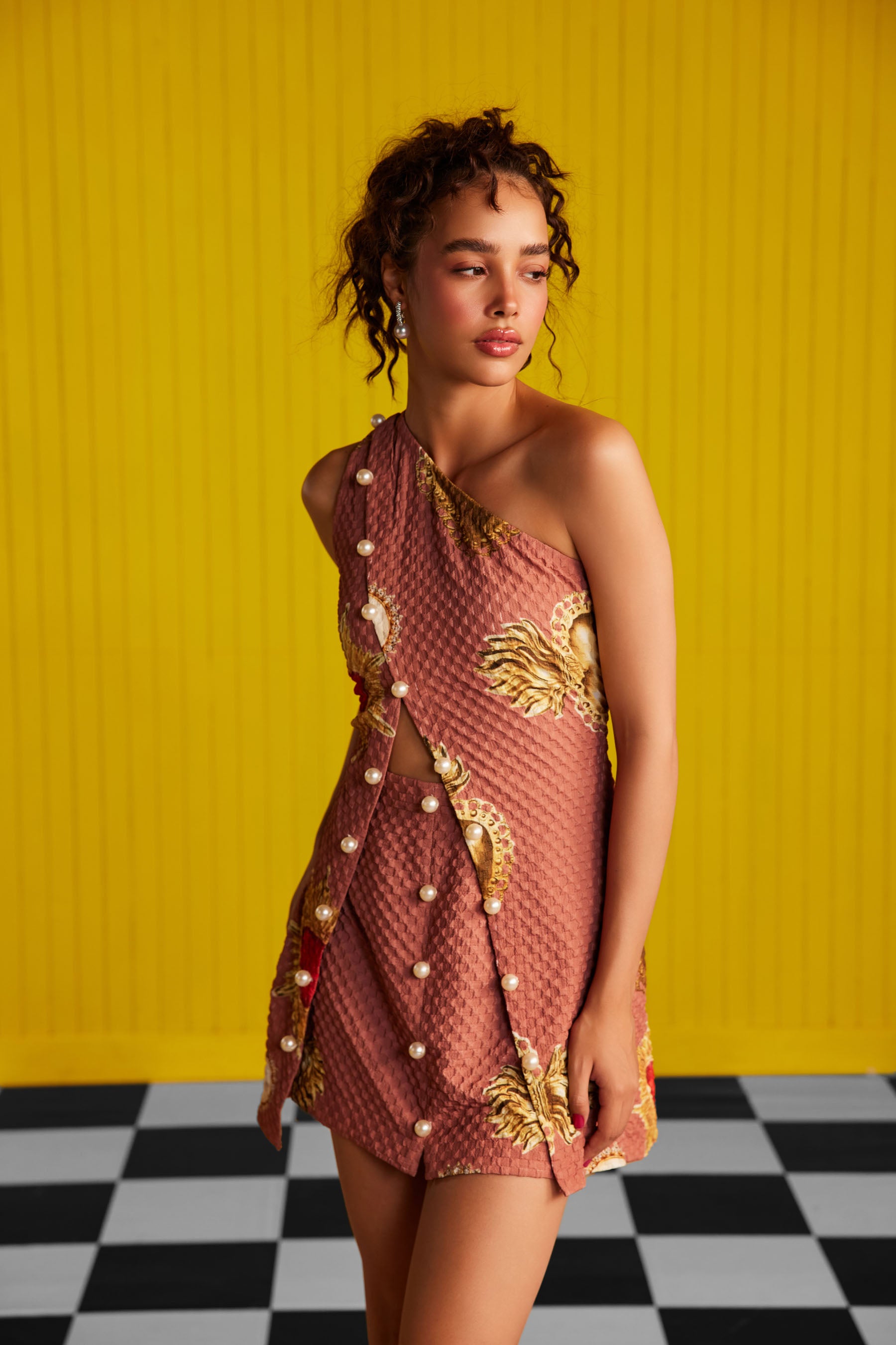 Our Chic style one shoulder top is crafted in 3d textured fabric. The top features assymetric placket that is beautifully accentuated with pearl buttons flowing down the hemline. Best paired with the textured skirt which is adorned with the pearl buttons in the center. It’s a perfect sundowner springtime style.