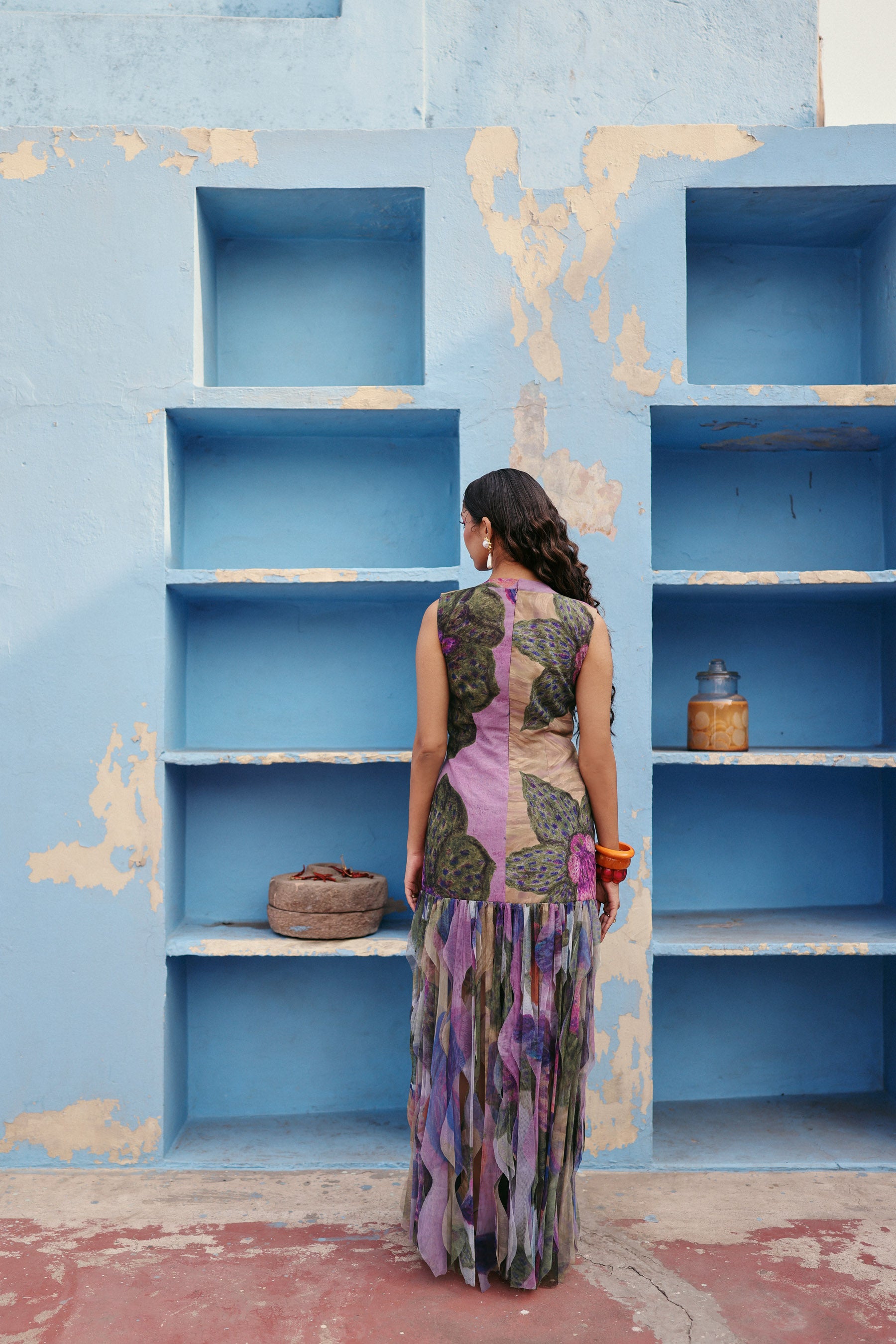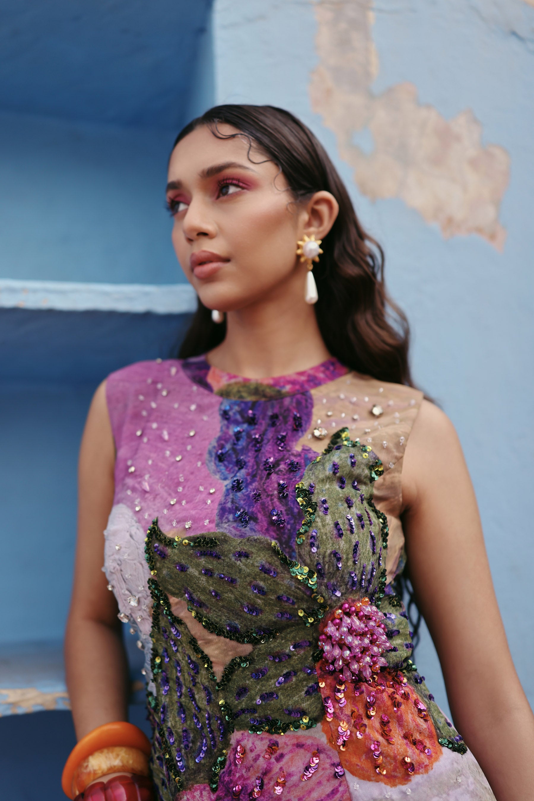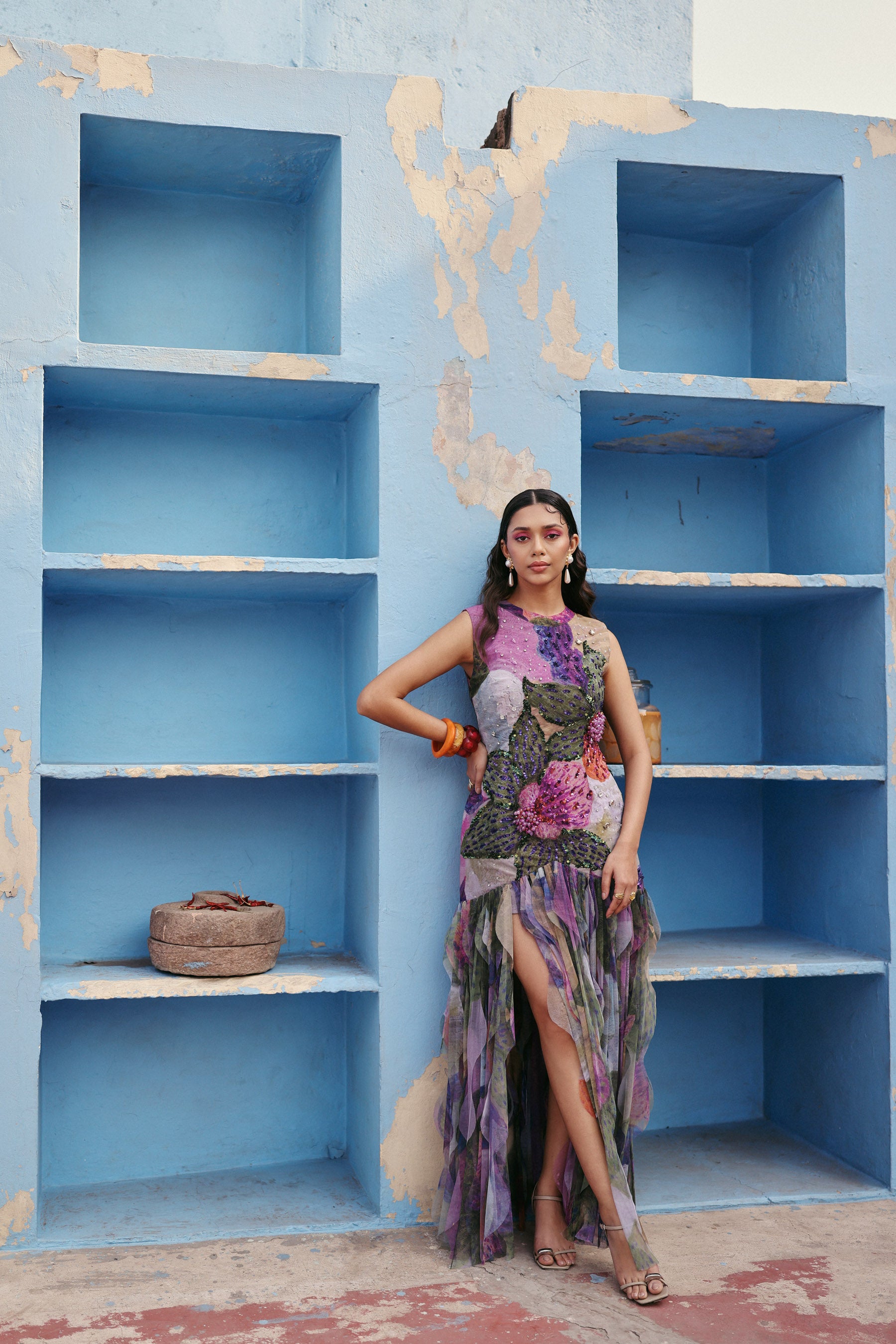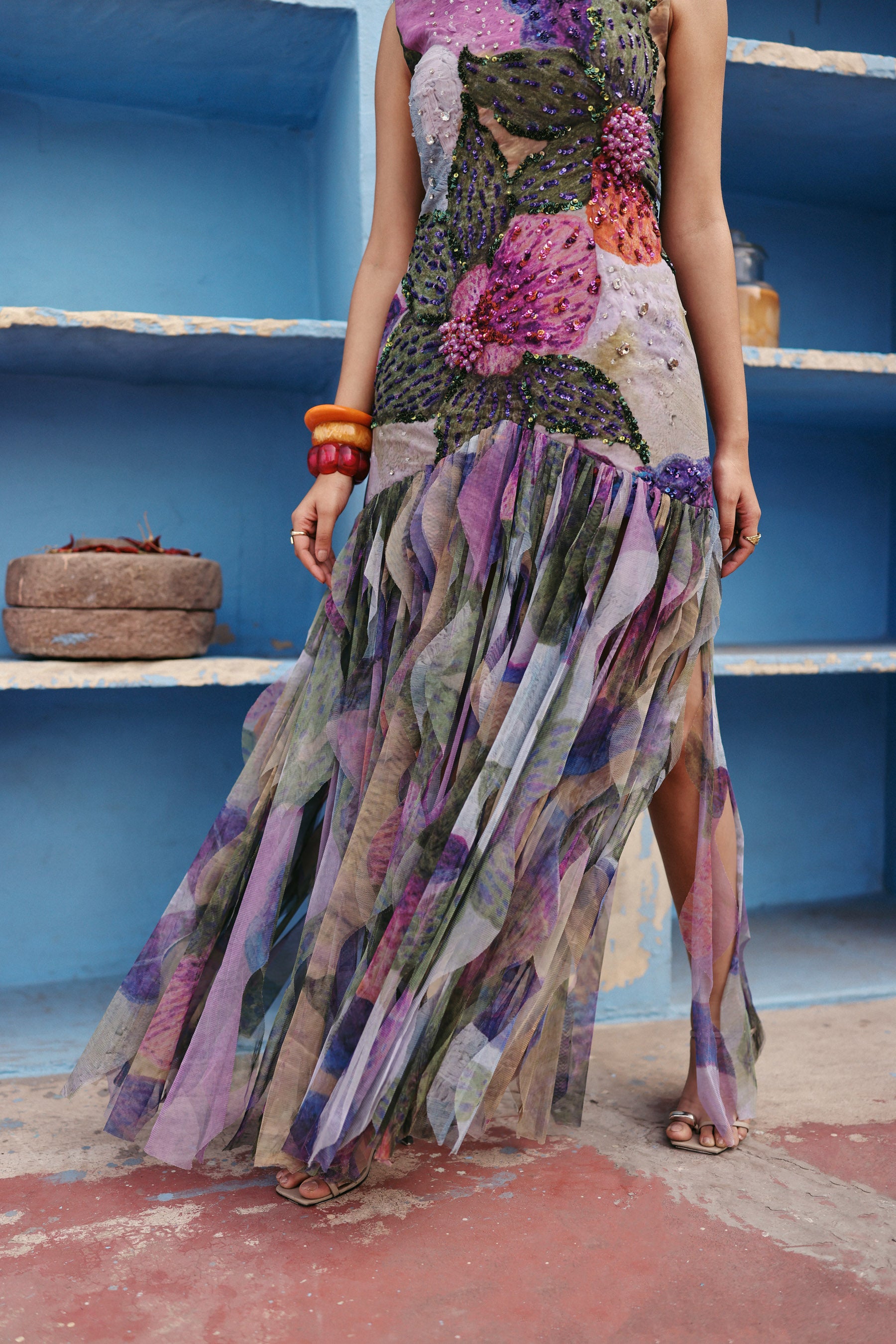 Sleeveless statement dress adorned with intricate hand embellishments and bold floral artistry, flowing into a soft sheer layered finish for dramatic elegance and refined movement.