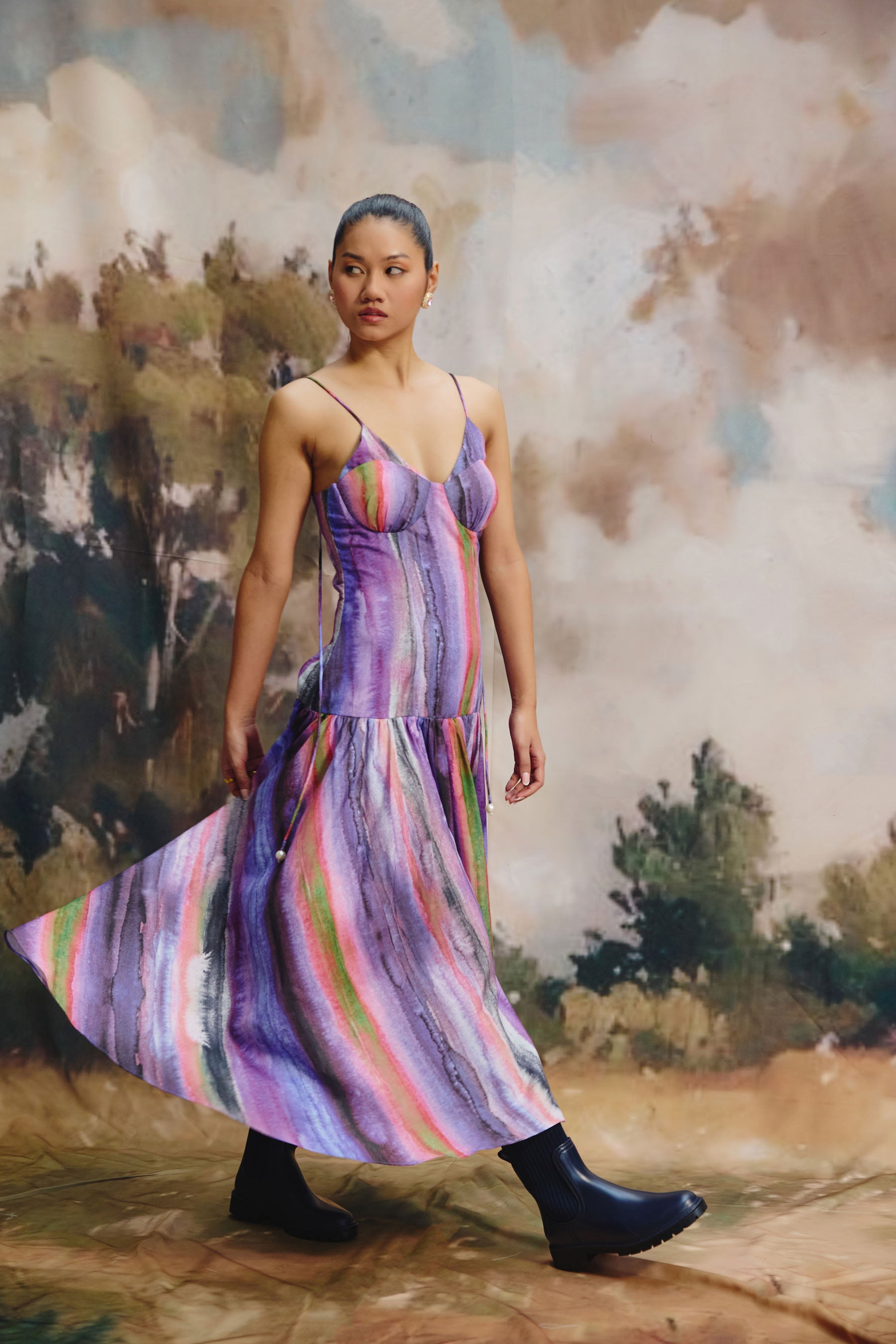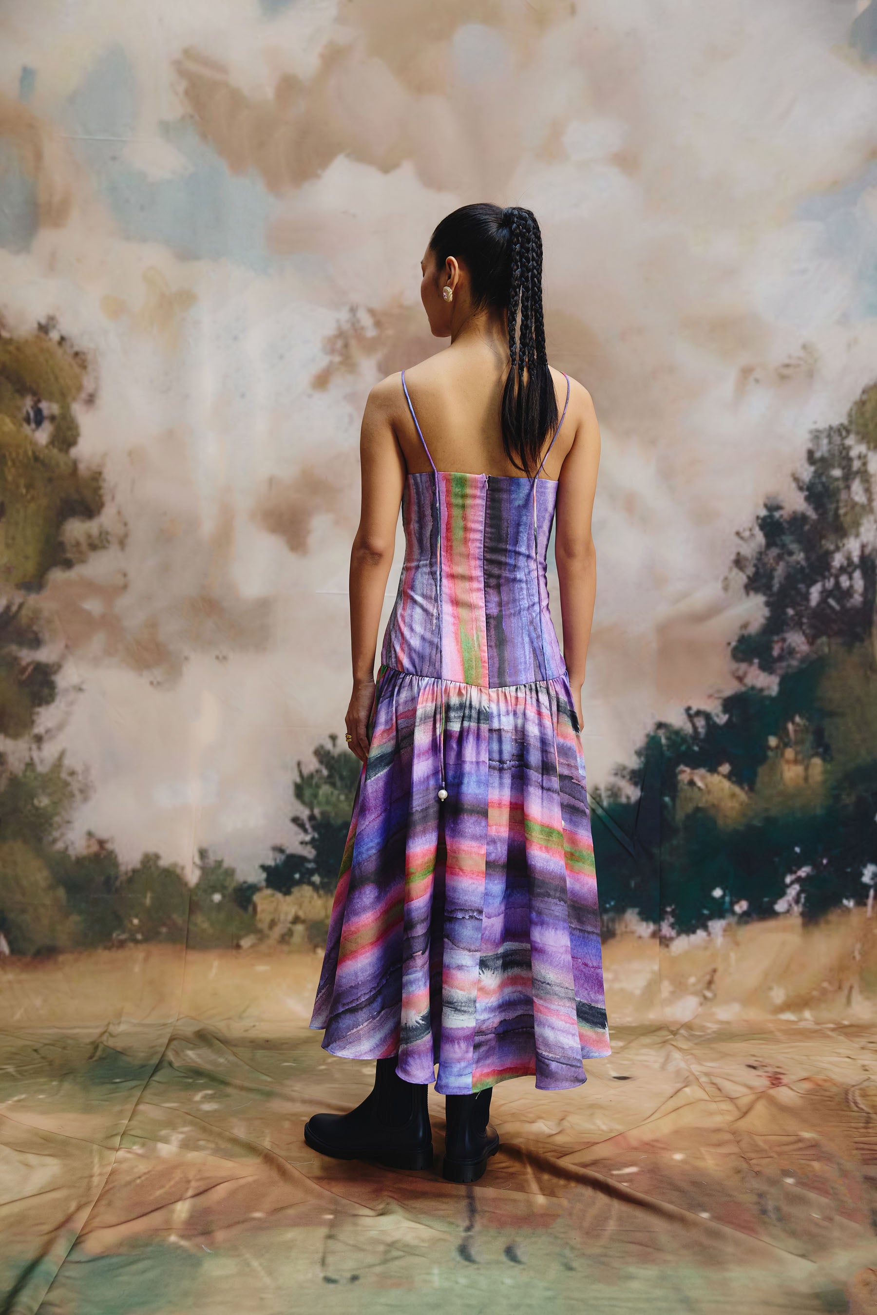 Crafted from a lightweight fabric, the midi-length dress with thin straps features a flowy silhouette with a multicolored striped pattern in shades of purple, pink, green, and black. The vibrant hues add a playful charm, perfect for festive occasions or stylish evenings.