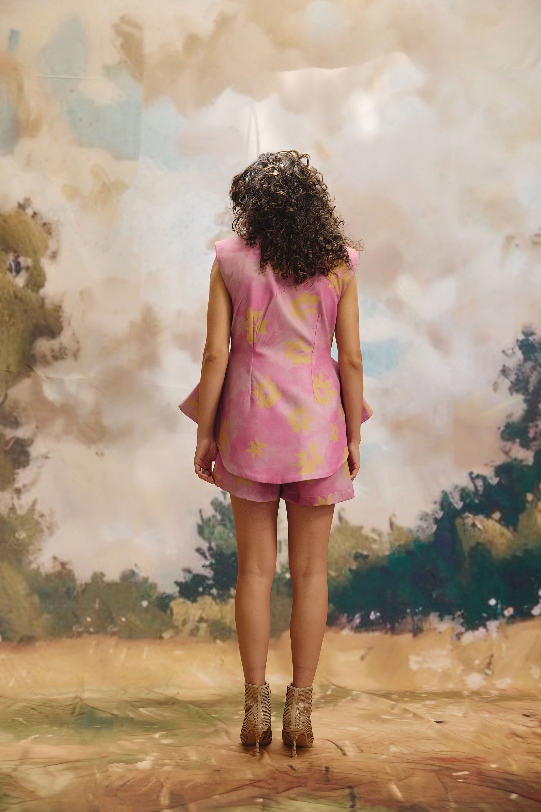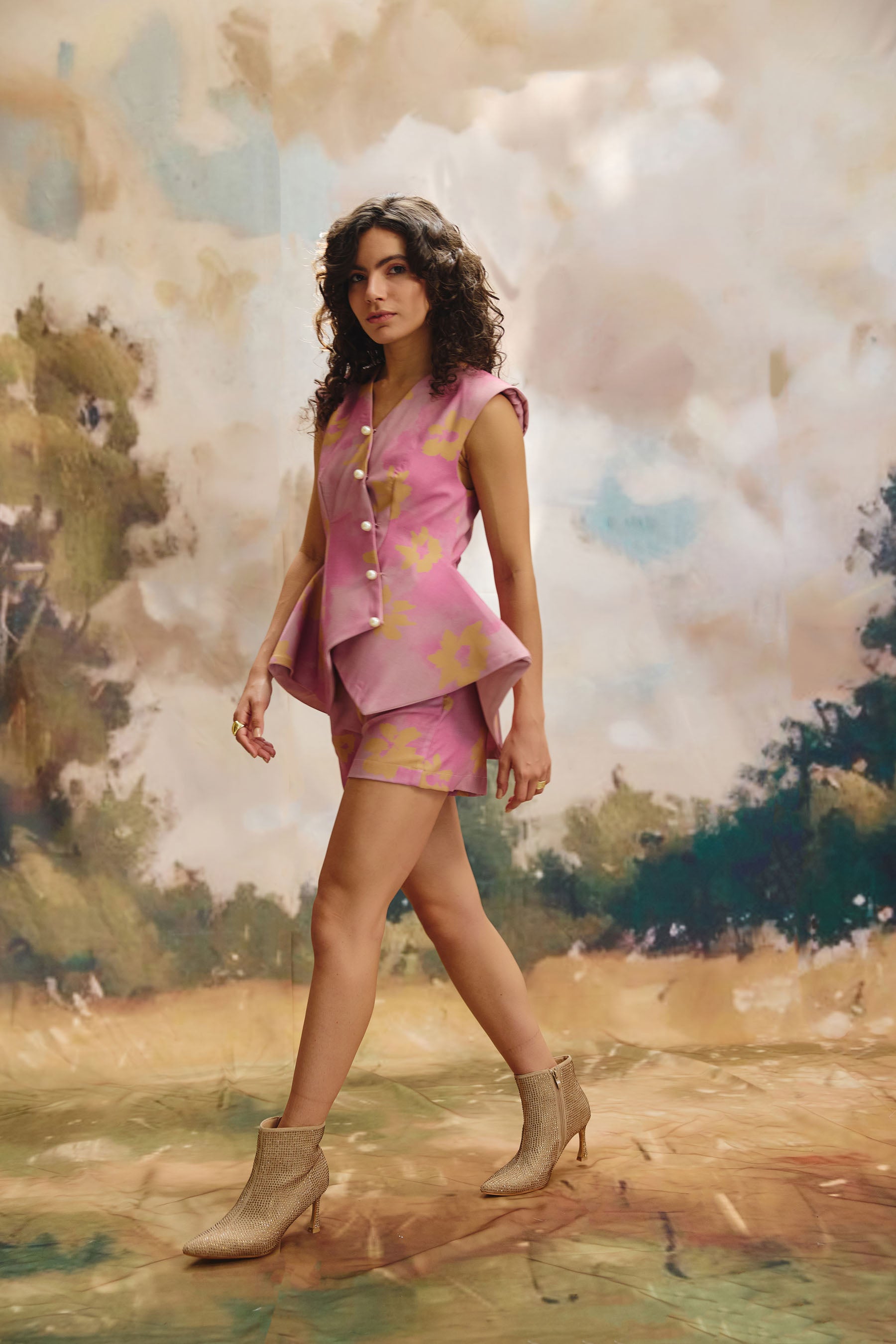 This stylish ensemble redefines playful sophistication with its pink linen top featuring yellow floral accents and matching shorts. The peplum detail on the top adds a touch of whimsy, creating a youthful and chic look ideal for casual celebrations or trendy outings