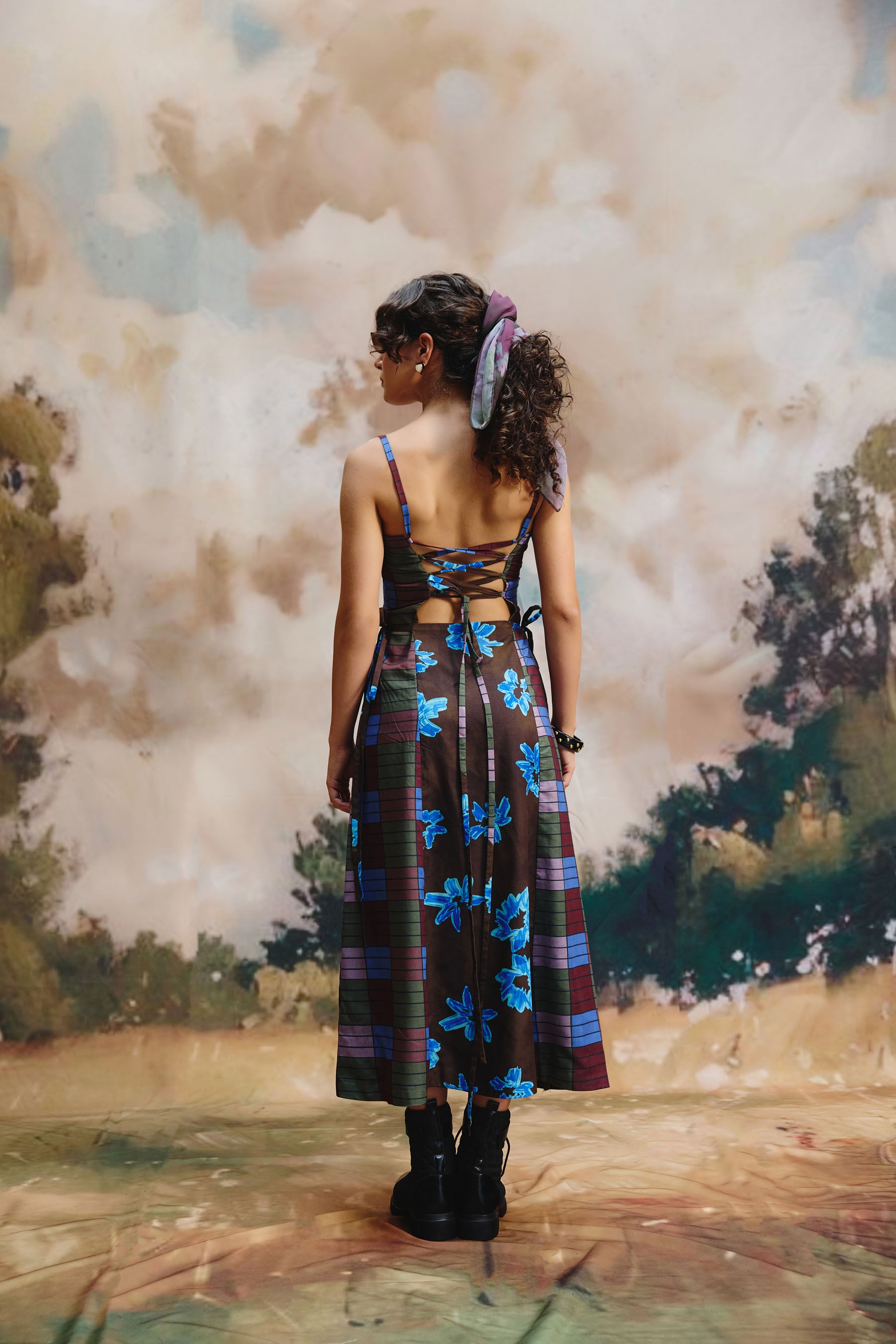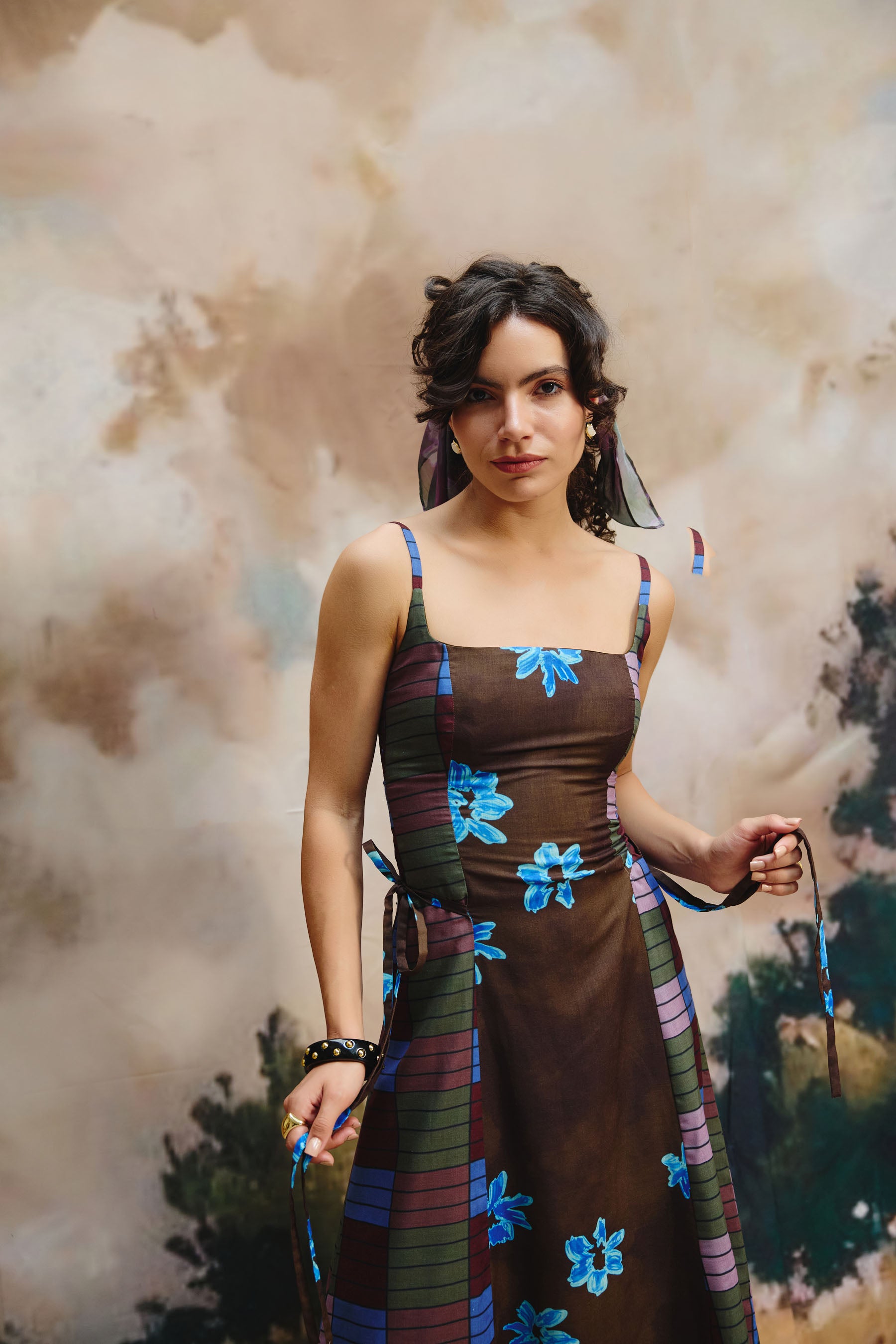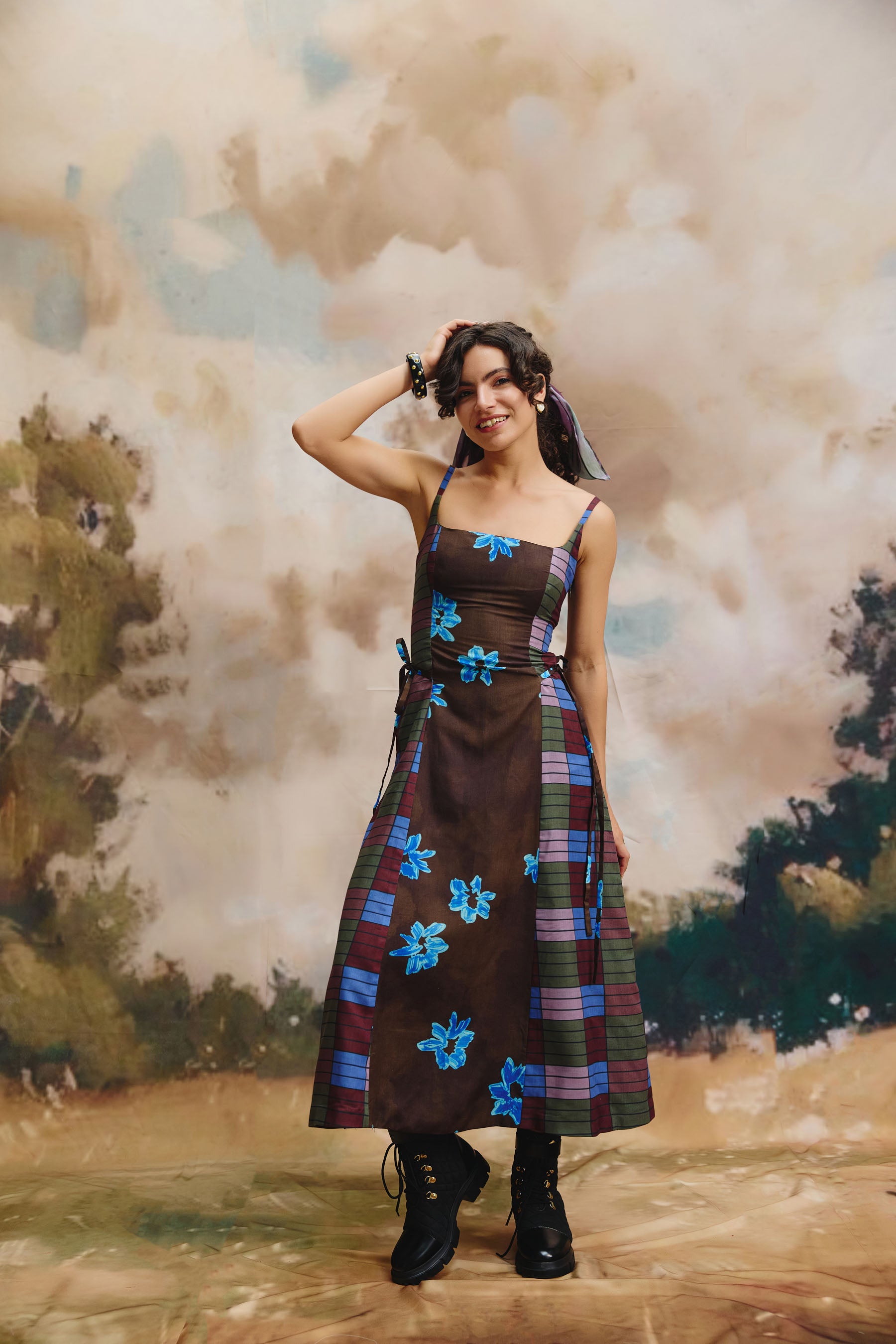 Crafted from a linen fabric, this sleeveless midi dress features thin straps and a flared skirt. The brown base with blue floral accents and plaid details on the sides adds a unique charm, perfect for casual outings or stylish gatherings.