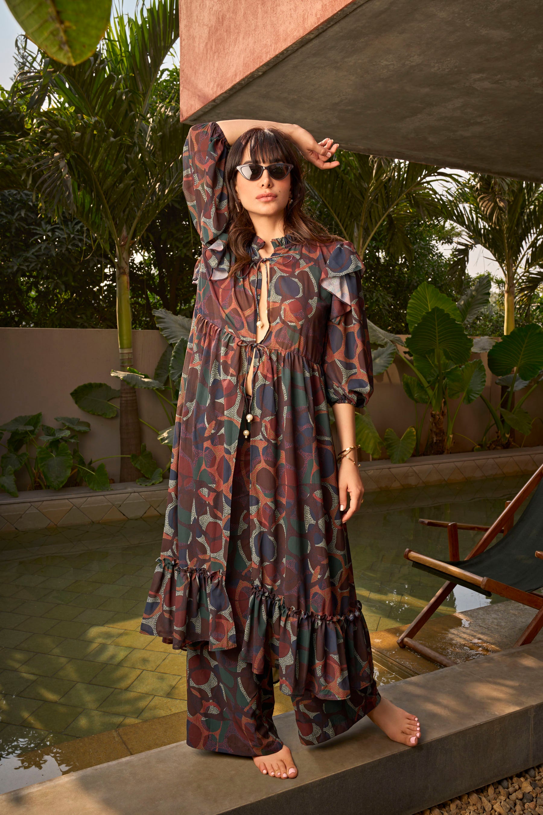 Dive into style with our 'Pool Party' coords! This playful set features a long top with a sassy middle slit and tie-up detailing, adorned with flirty ruffles all around. Paired with flowy pants, it's your go-to ensemble for making a splash at any summer soirée