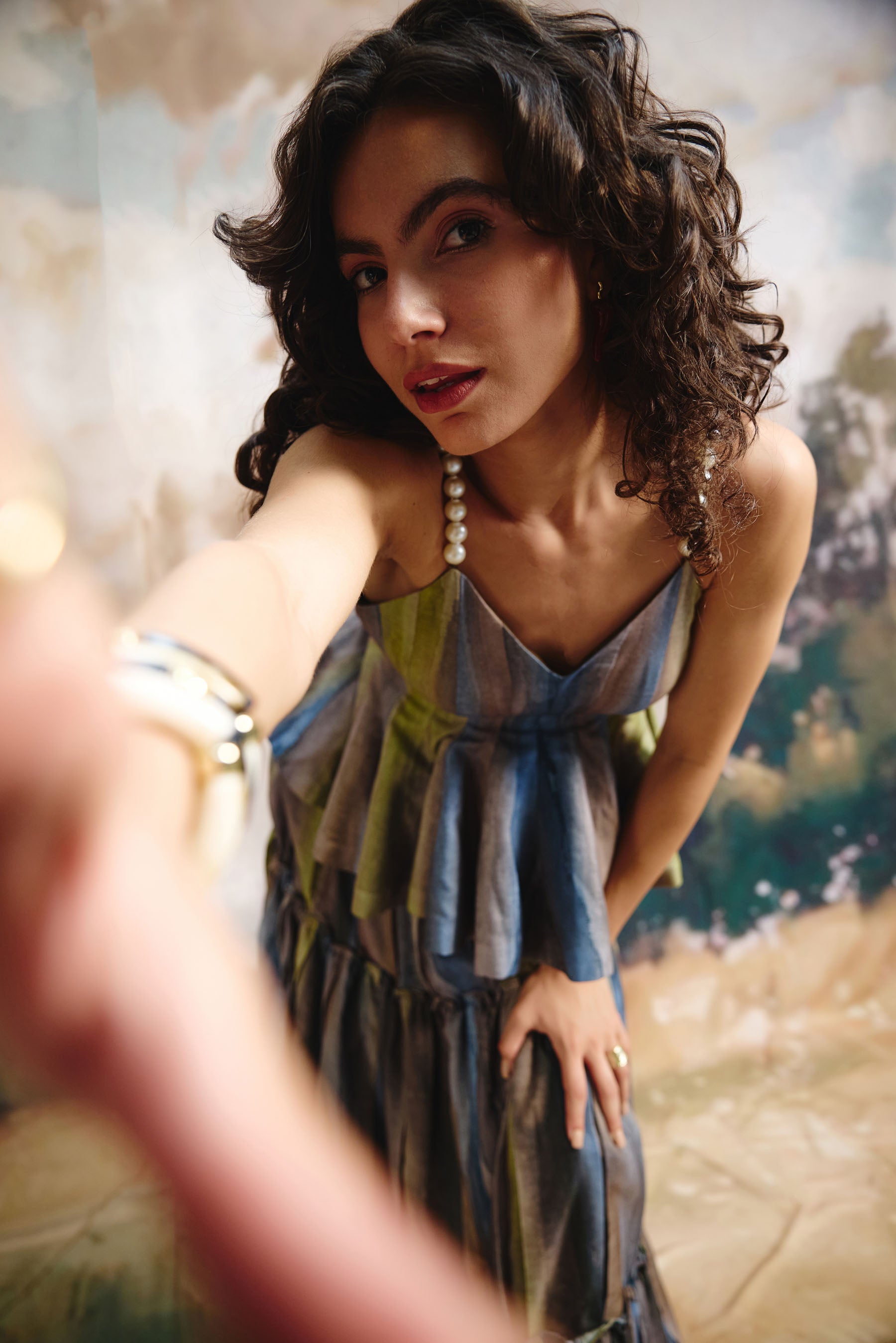 The Top is a statement piece, featuring a design with subtle pleats and gentle gathers, adorned with delicate pearl accents on the shoulders that adds a touch of refined elegance.