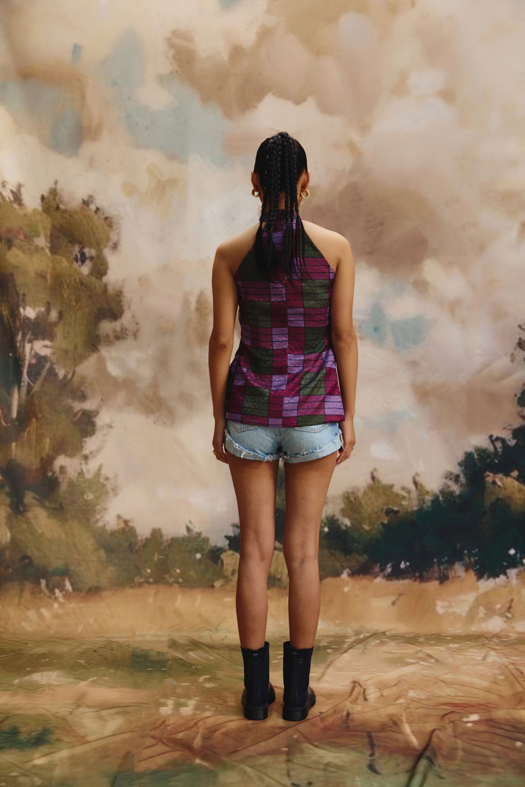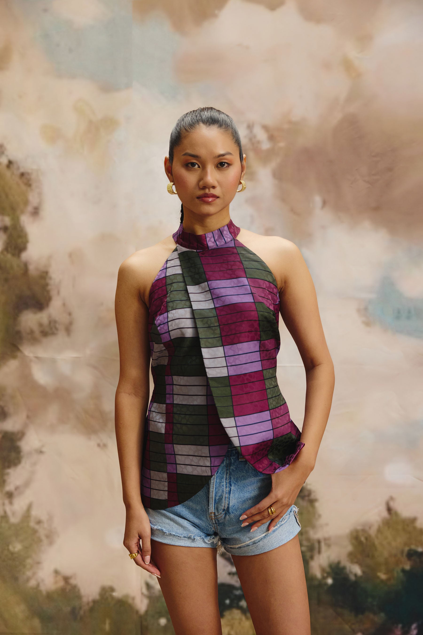 The sleeveless halter neck top overlaps in the front and is paired with wide legged pants, both created with a self textured fabric with a luxurious sheen on it