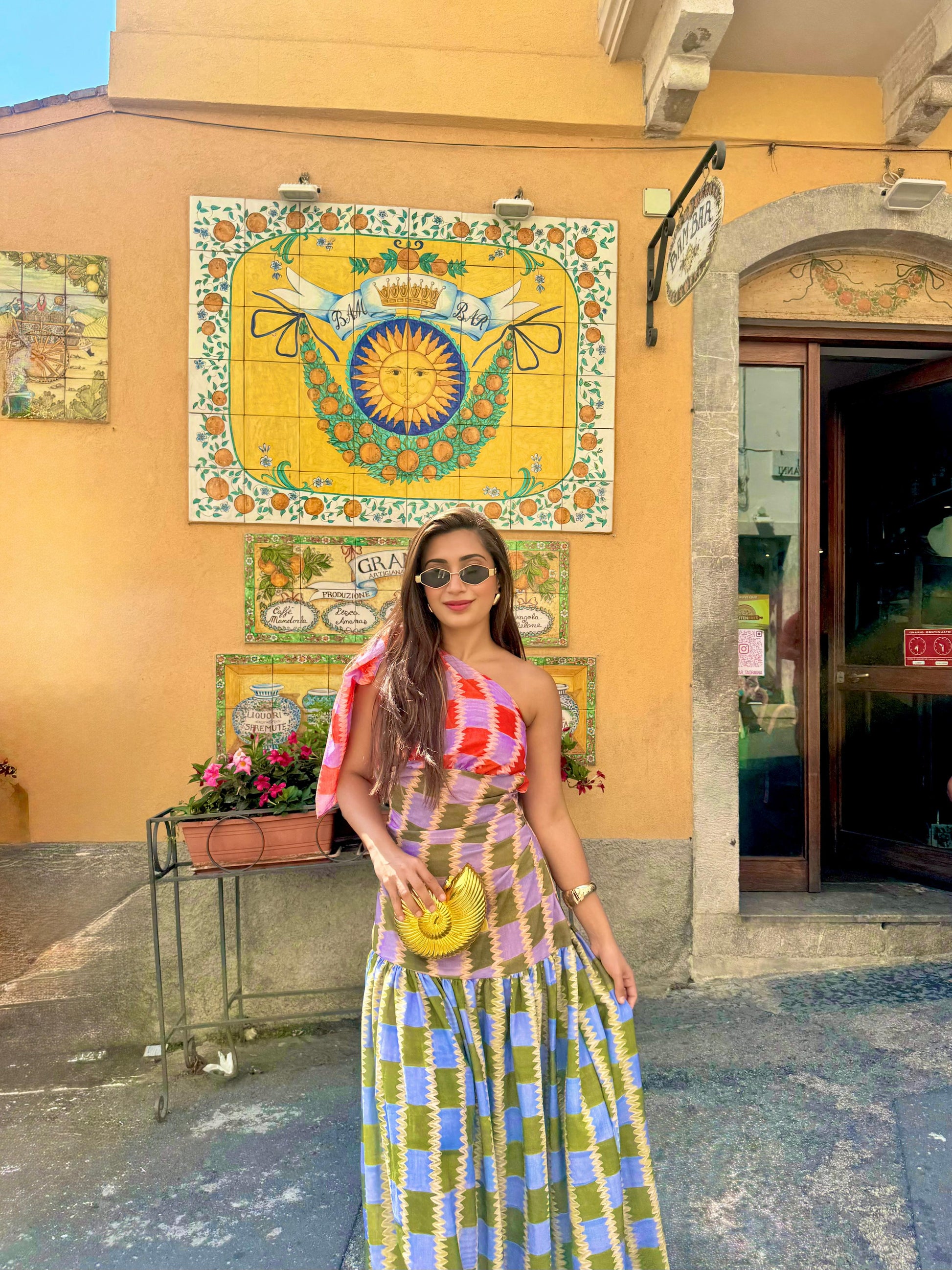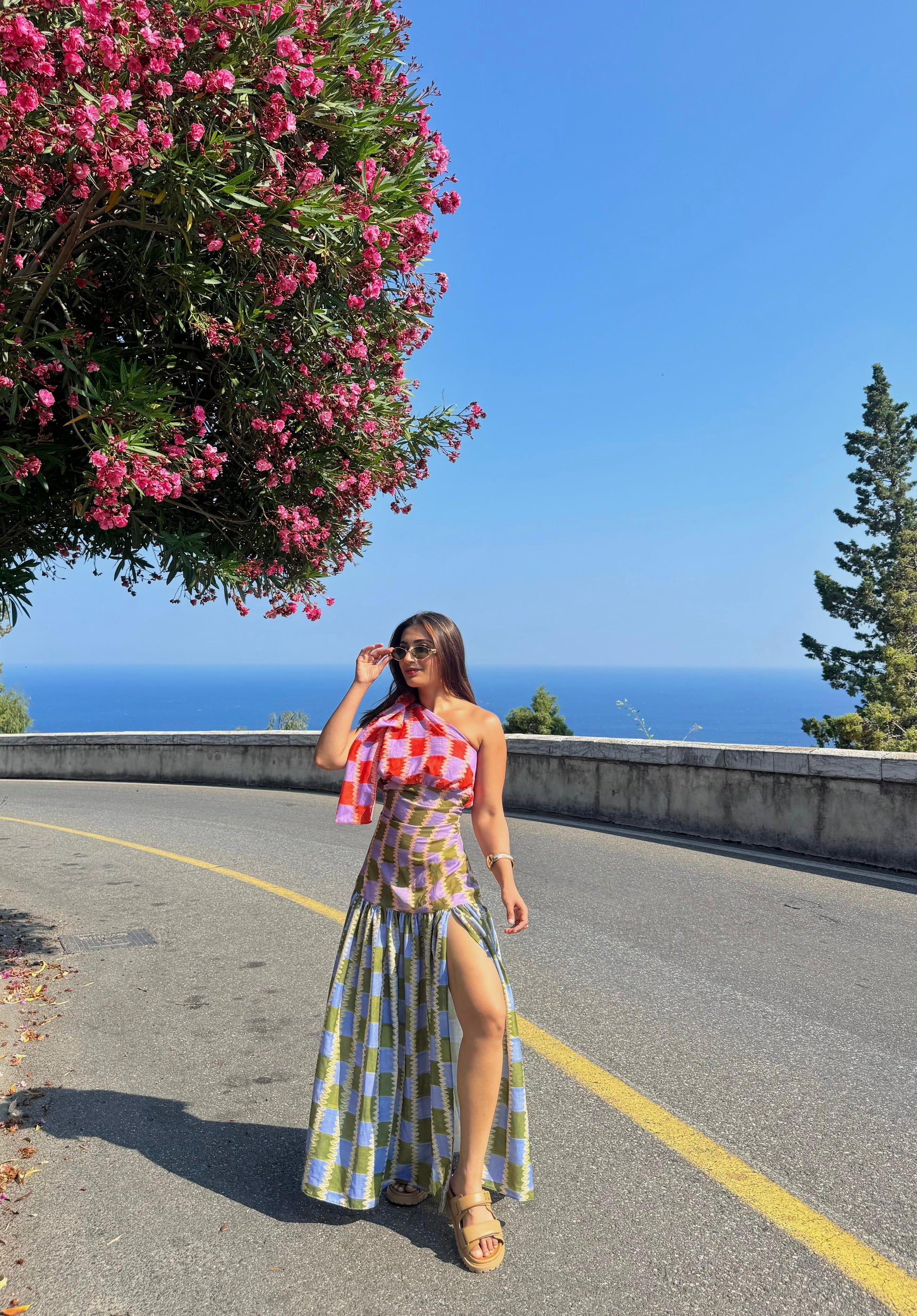 This one-shoulder long dress features a tie closure at the shoulder for a secure fit. The dress has a slightly fitted bodice under the bust, gradually flowing out for a flattering silhouette. The lower part of the dress is gathered from mid-thigh to the bottom, creating texture and movement. A slit adds a bold detail, enhancing the design while offering ease of movement. This dress combines elegance with a touch of drama, making it ideal for evening events or special occasions.