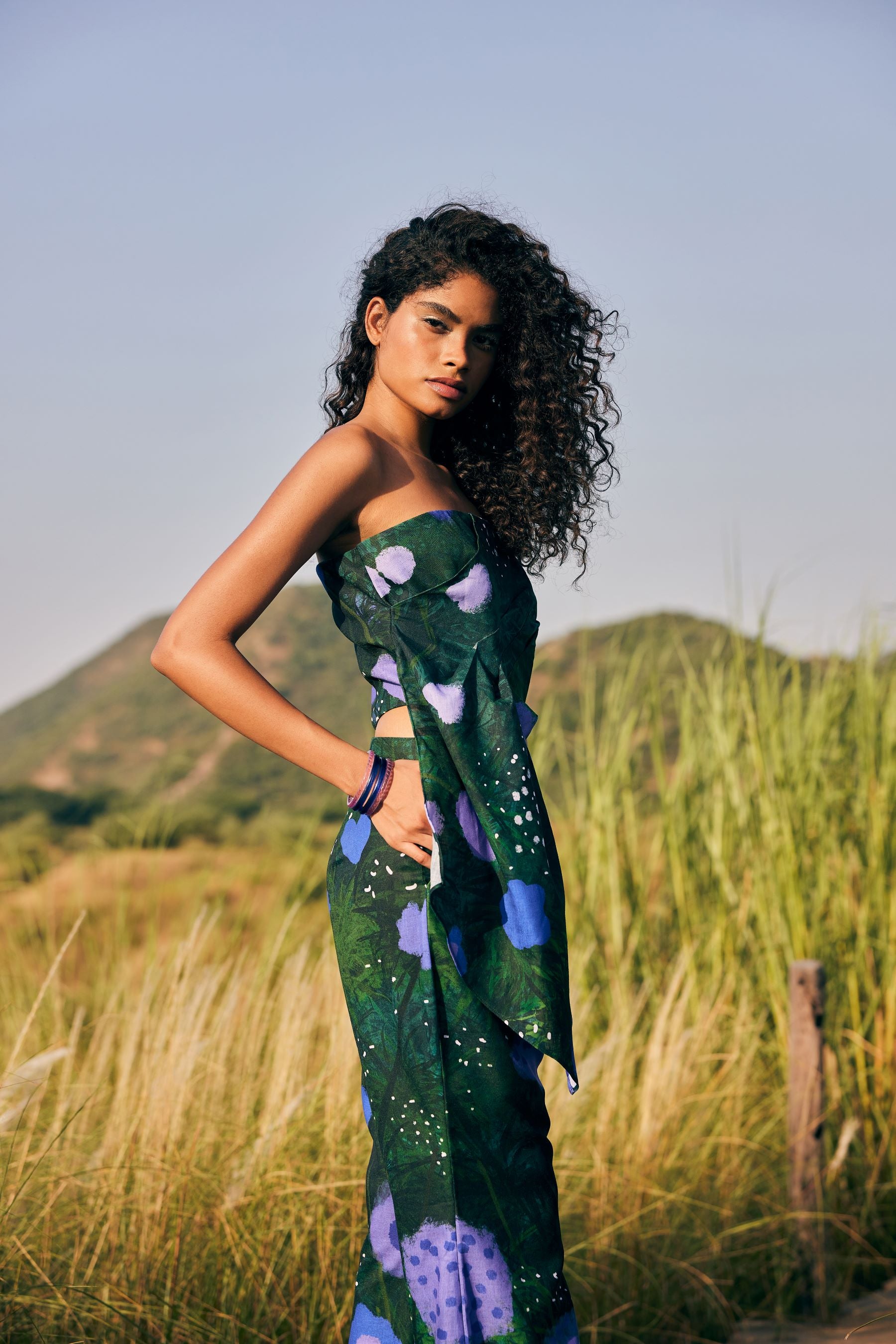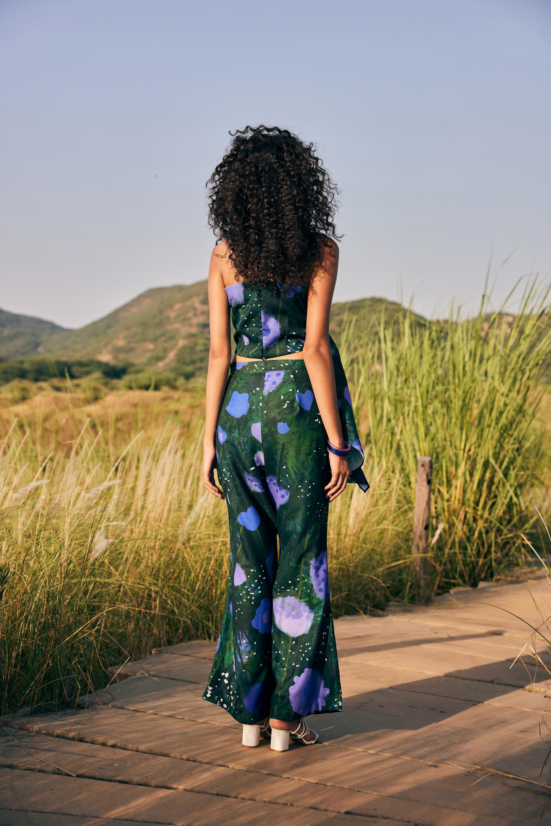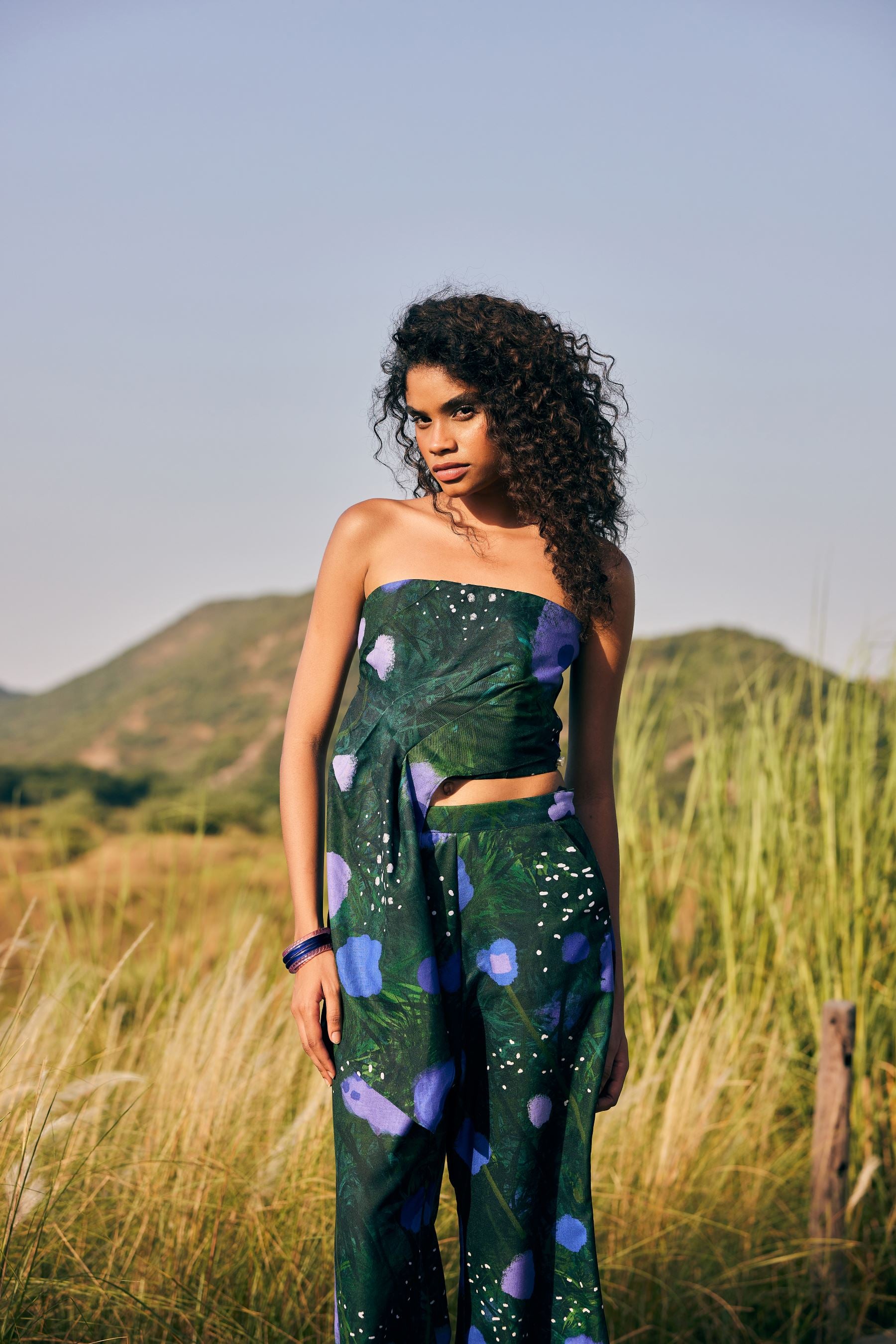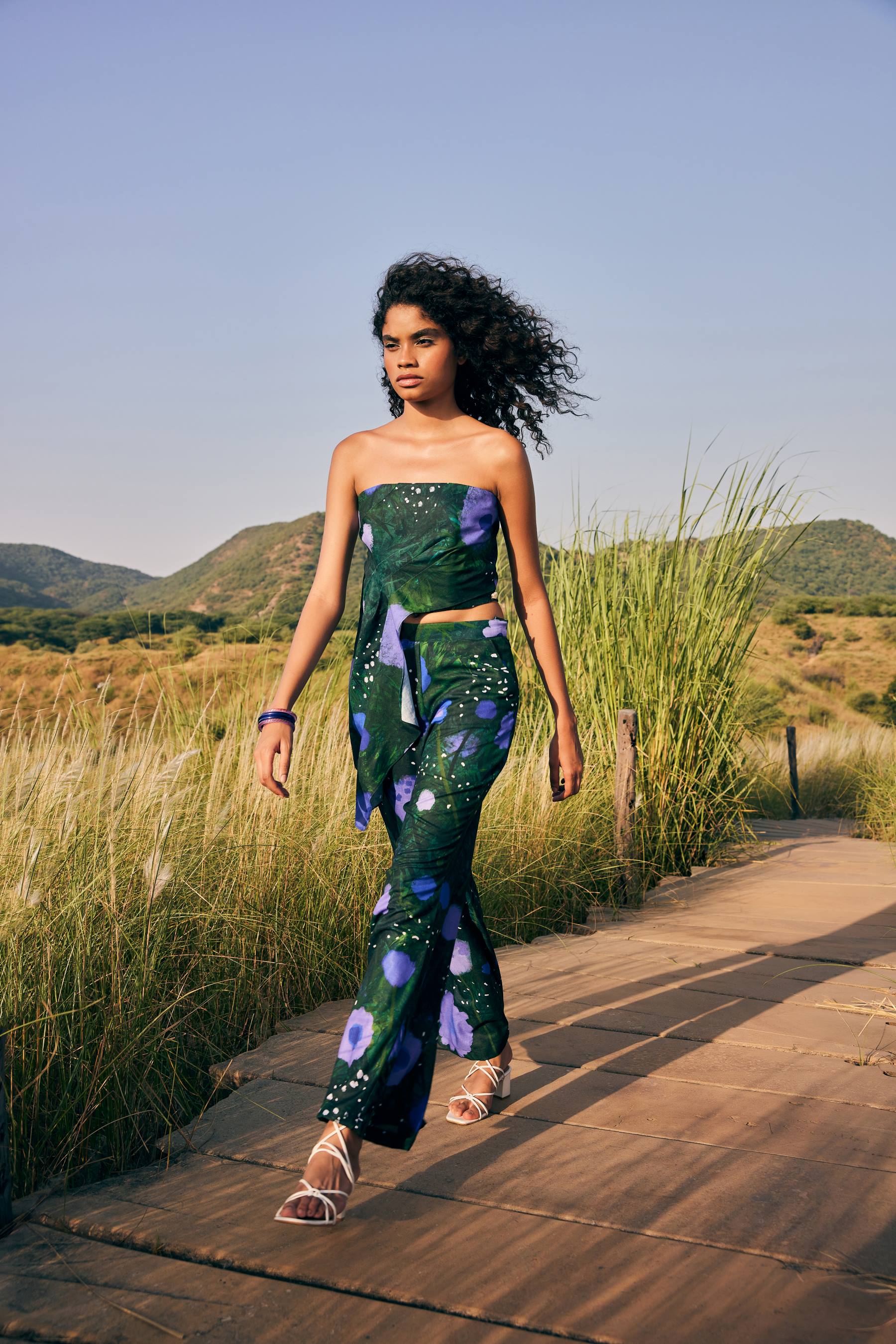 This outfit features a stunning top adorned with an elaborate floral pattern that